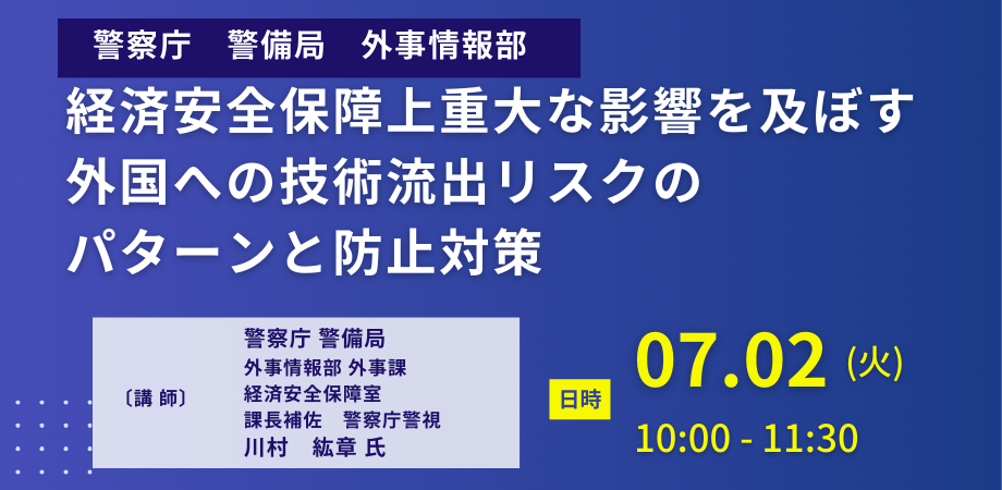 【JPIセミナー】「経済安全保障上重大な影響を及ぼす外国への技術流出リスクのパターンと防止対策」7月2日(火)開催