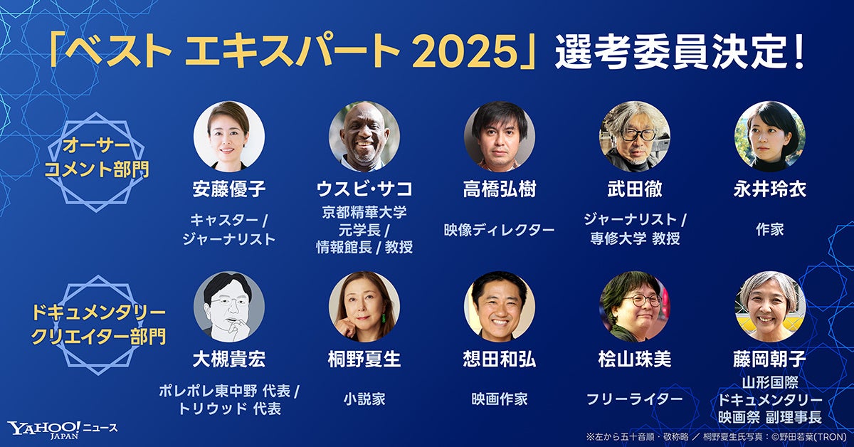 LINEヤフー株式会社(以下、LINEヤフー)が運営する日本最大級のインターネット配信サービス「Yahoo!ニュース」は、「Yahoo!ニュース エキスパート」に参加する専門家や有識者、ジャーナリスト、クリエイターを表彰する「ベスト エキスパート 2025」授賞式を、2025年2月26日(水)に開催します。また本日より、開催に先立ち、グランプリ各部門のノミネート一覧および初の試みとなるグランプリ選考委員の情報を特設ページで公開しました。