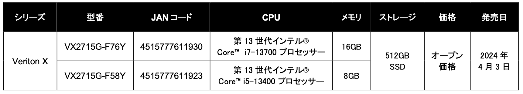 本製品いずれもOSにWindows 11 Proを採用。ストレージは512GB SSDを搭載。「VX2715G-F76Y」は、動画編集など負荷のかかる作業もスムーズに行える第13世代インテルⓇ CoreTM i7プロセッサー、メモリーは16GBを、「VX2715G-F58Y」は、第13世代インテルⓇ CoreTM i5プロセッサー、メモリーは8GBを搭載しています。