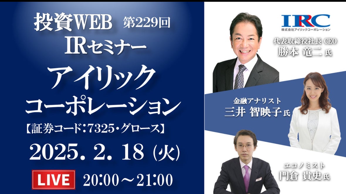 株式会社アイリックコーポレーション(本社:東京都文京区、代表取締役:勝本竜二 証券コード:7325)は、投資家の皆さまに対するIR活動の一環として、2025年2月18日に実施いたしました2025年6月期第2四半期(中間期)決算説明会の動画及び書き起こし記事を公開いたしました。当社の決算等の状況や3か年計画の進捗状況についてご理解を深めていただく一助となれば幸いです。