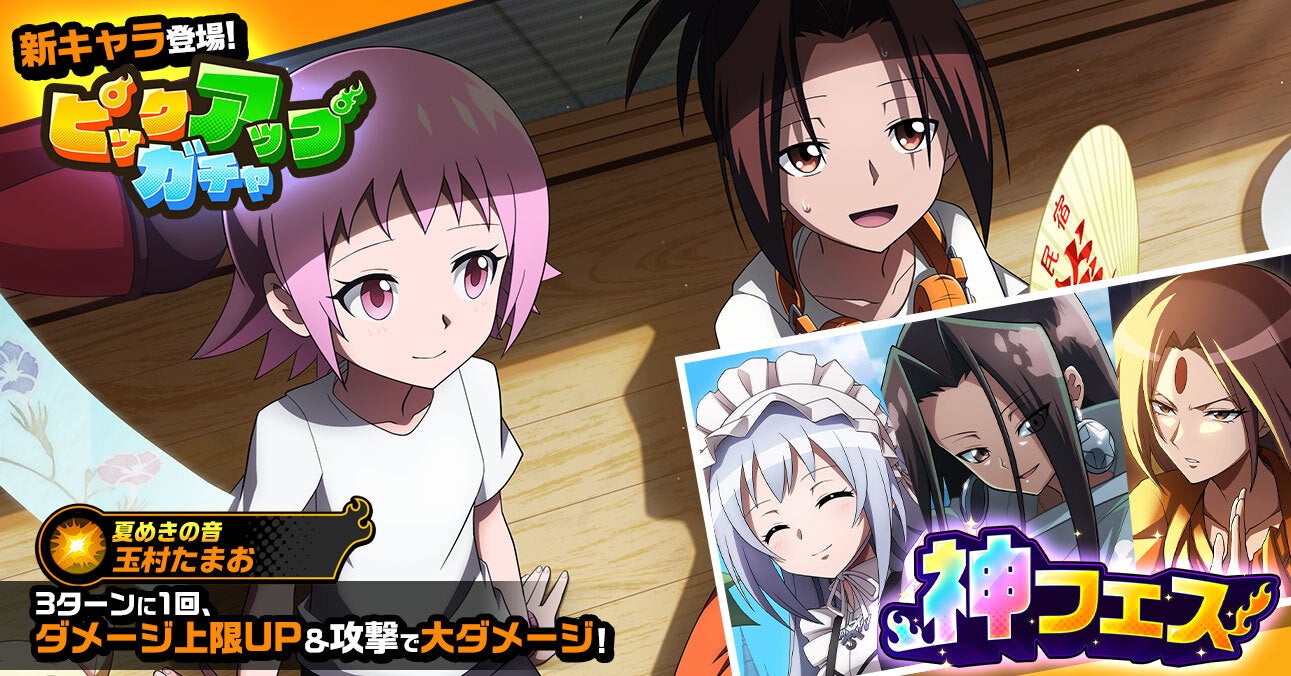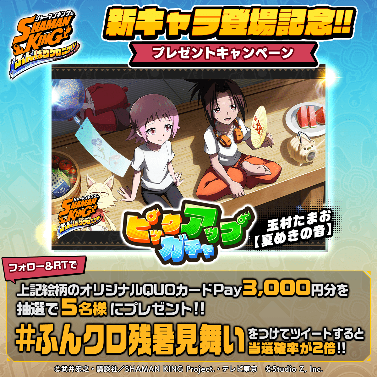 Studio Z株式会社(本社:東京都港区、代表取締役CEO:池幡賢)は、好評配信中のTVアニメ『SHAMAN KING(シャーマンキング)』を題材とした初のスマートフォン向けアプリゲーム『SHAMAN KING ふんばりクロニクル(通称:ふんクロ)』にて、最大で1,000たま&★3キャラ確定ガチャチケットが無料で貰える残暑見舞いログインボーナスを開催。今回の神フェスガチャでは新キャラ「[夏めきの音] 玉村たまお(CV: 水樹奈々)」も登場いたします。