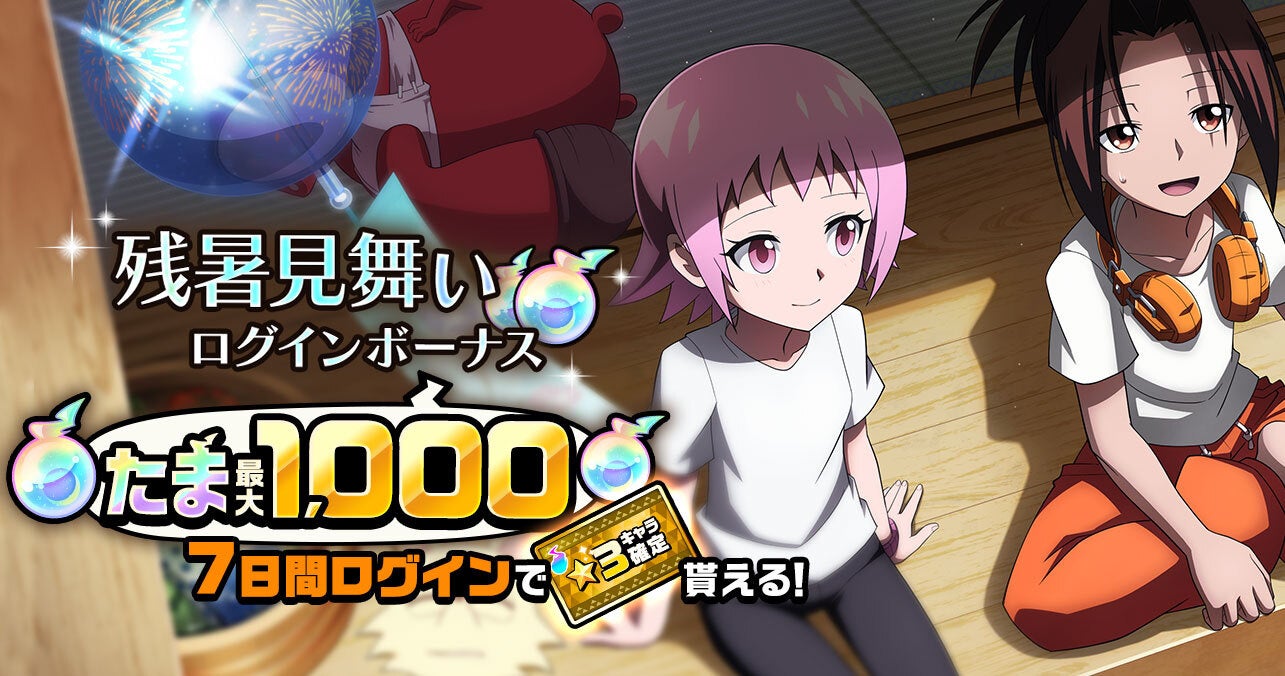 『SHAMAN KING ふんばりクロニクル』が、最大で1,000たま&★3キャラ確定ガチャチケットが無料で貰える残暑見舞いログインボーナスと、神フェスガチャを開催!