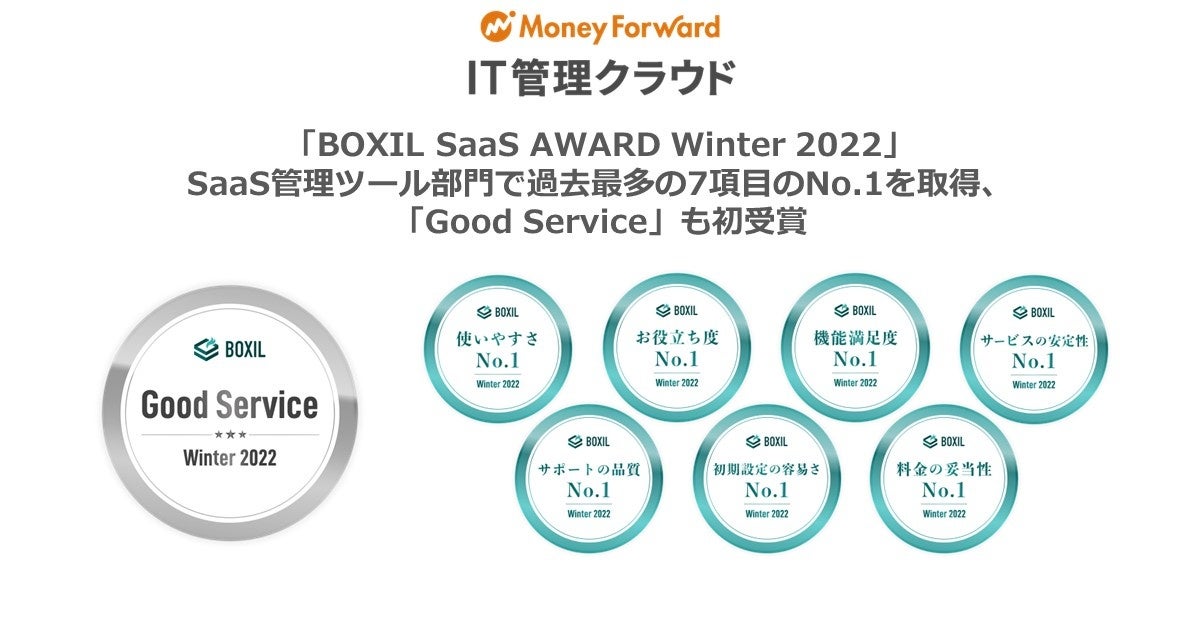 『マネーフォワード IT管理クラウド』、「BOXIL SaaS AWARD Winter 2022」SaaS管理ツール部門で過去最多の7項目のNo.1と「Good Service」を初受賞