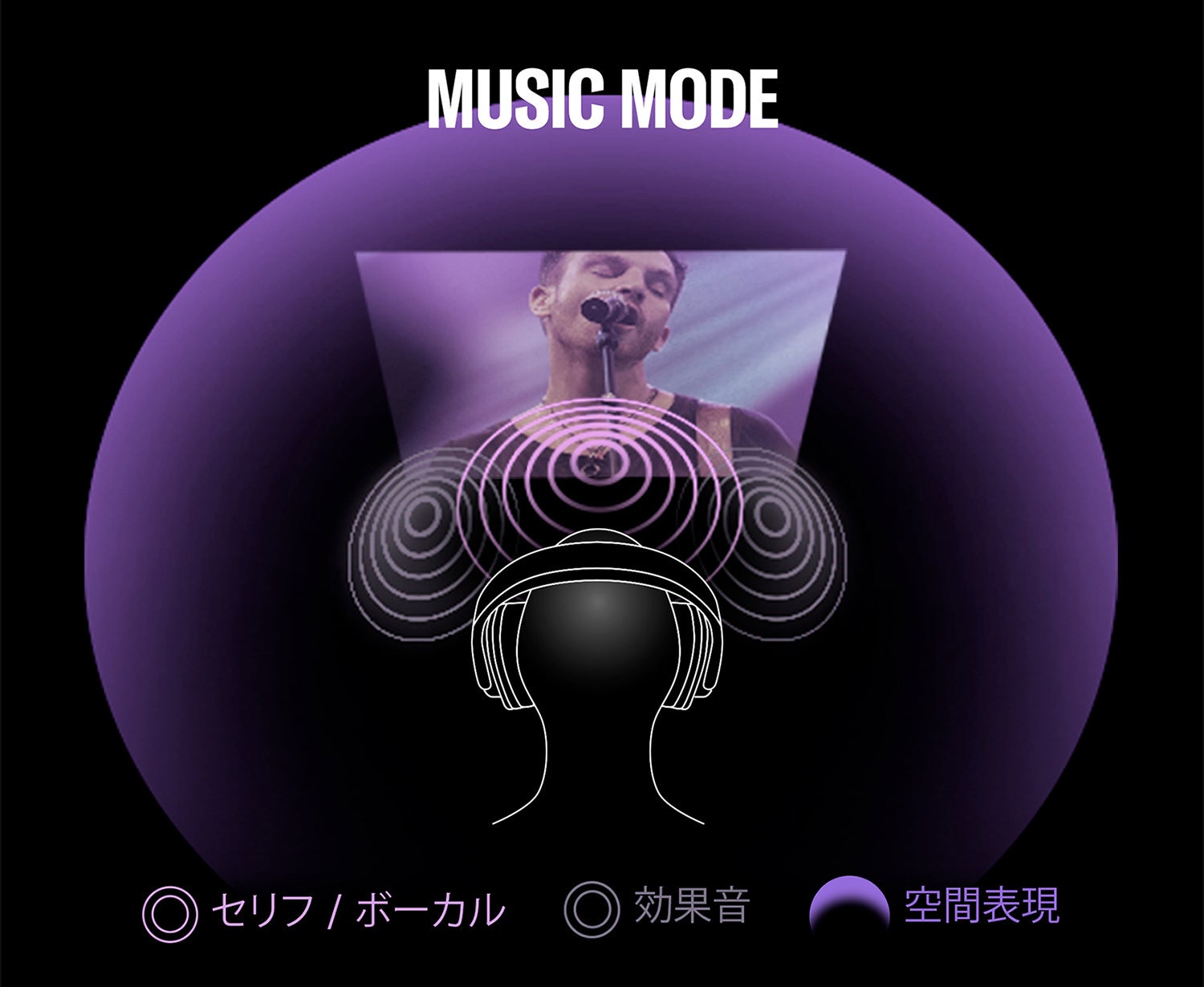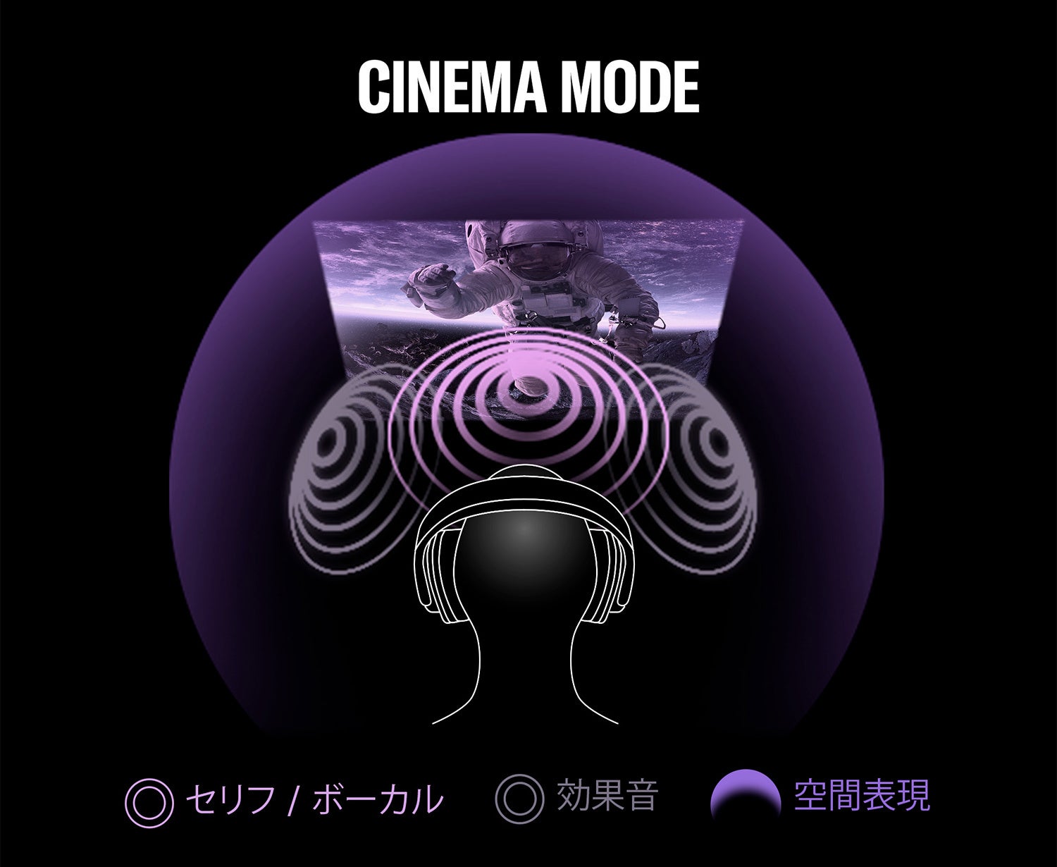 映画で重要となる3つの要素“セリフ”や“効果音”、“BGM”を、それぞれしっかり聴き取りやすい音で再生します。音の位置関係がわかりやすく、効果音なども迫力いっぱいに再現し、まるで映画館で観るような没入感の高い音で映画やドラマが楽しめます。