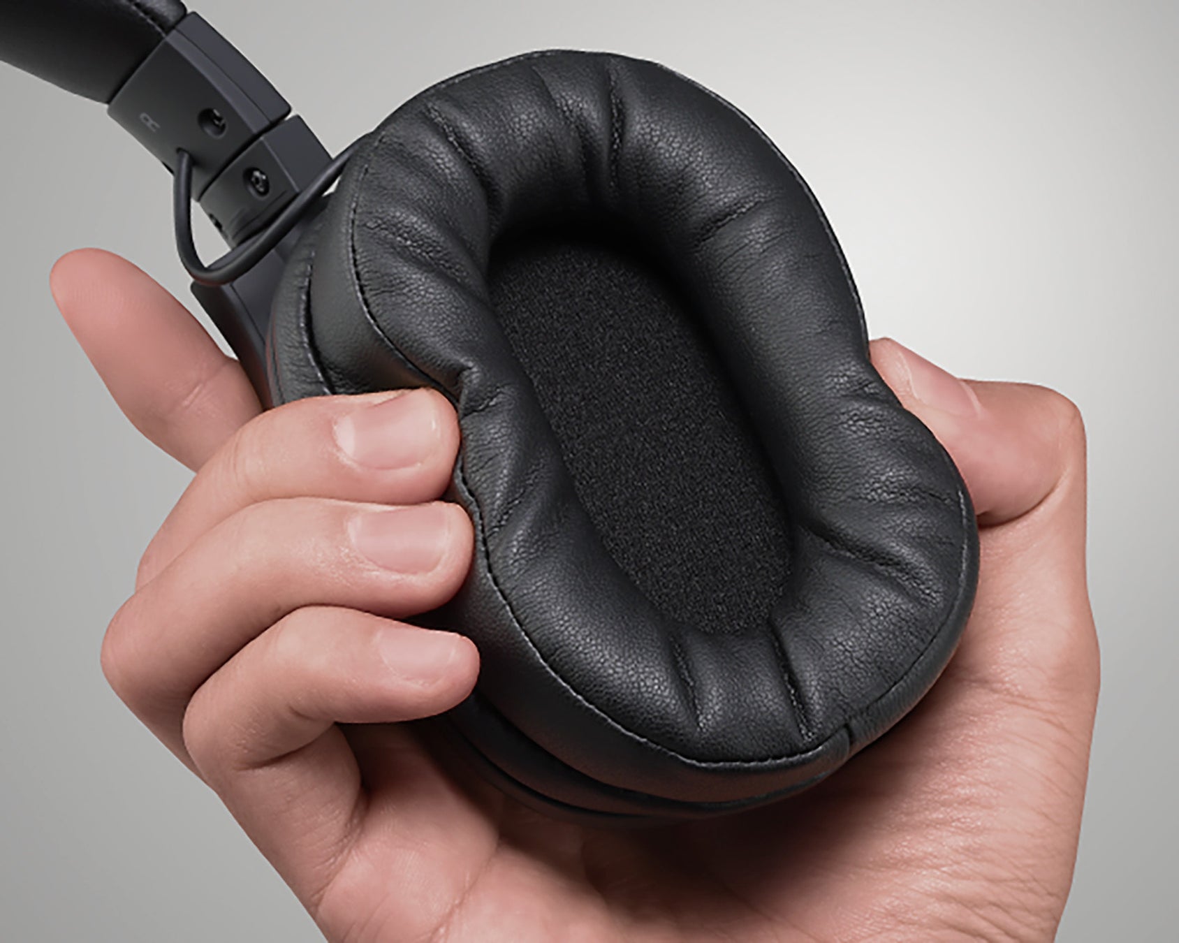 映画などでの視聴も疲れることなく心ゆくまでコンテンツを楽しめるよう、装着性に優れたイヤーパッドを『YH-L500A』専用に開発しました。形状は耳をしっかりと包み込む楕円形としたうえ、耳に優しくフィットする柔らかなクッション材を使用しています。表面素材は3層構造の合成レザーを採用することでシワが入りにくく、肌触り、耳当たりのよい快適な着け心地を実現しました。またハウジングの形状もしっかり耳にフィットするよう下部に傾斜をもたせ、イヤーパッド下部が耳や頭部に密着しないことで生まれる音漏れ、音質劣化を抑える、優れた装着性と音質を両立した仕様としています。