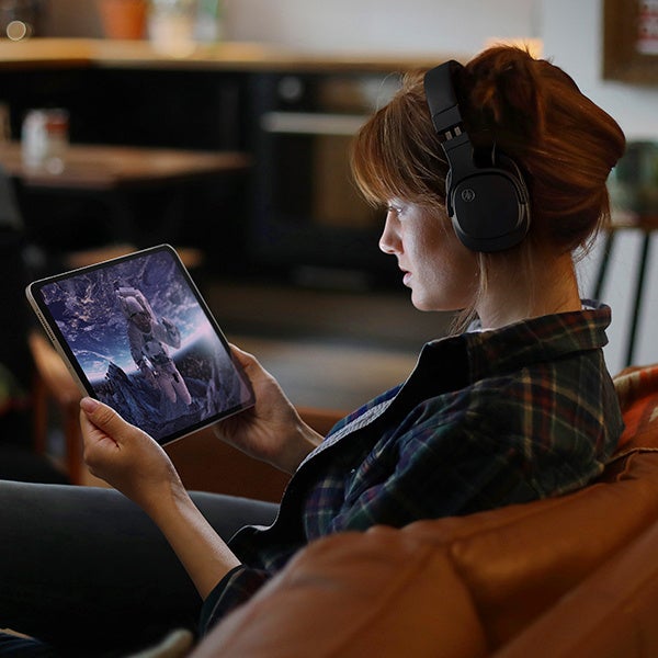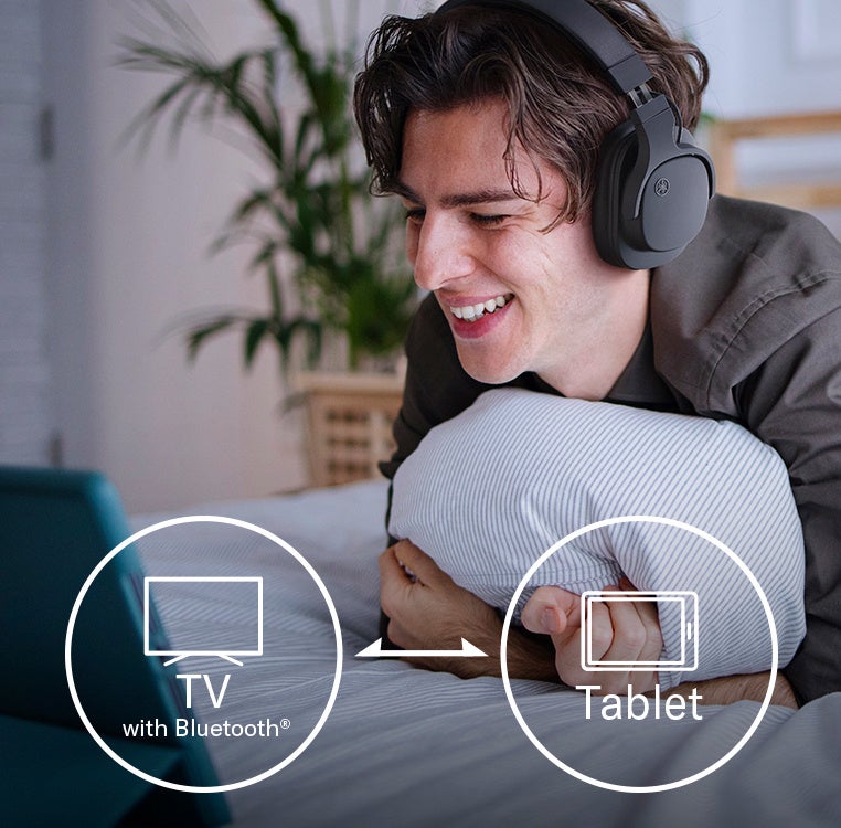Bluetooth®のマルチポイント接続に対応しているので、タブレットやスマホをはじめ、Bluetooth®対応のテレビやPCなどを2台まで同時に接続可能です。リビングのテレビで観ていた映画の続きを寝室のタブレットで観るなど、様々な機器とシームレスに繋いで自由に楽しむことができます。他にも、PCと接続してWeb会議をしているときに、スマートフォンに電話がかかってきた場合でも、切り替えなしでスームズに対応できるので、ビジネスシーンでも便利に使えます。