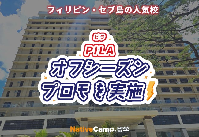 ネイティブスピーカーと回数無制限のオンライン英会話サービス「ネイティブキャンプ英会話」を展開する株式会社ネイティブキャンプ(東京都渋谷区 代表取締役: 谷川国洋)は、海外留学エージェントサービス「ネイティブキャンプ留学」において、フィリピン・セブの人気校「PILA」でオフシーズンプロモを実施いたします。
