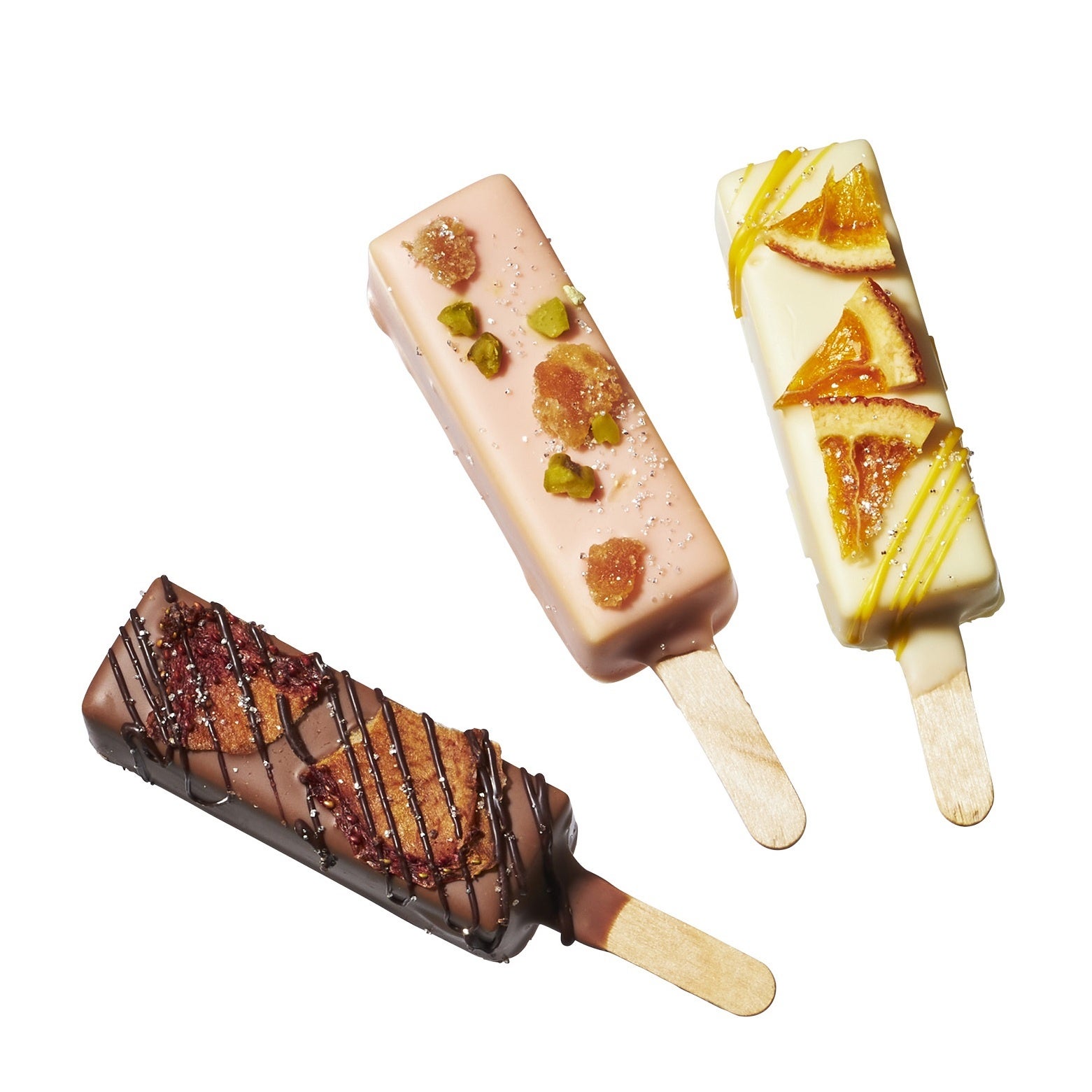 (左)「ベルアメール」パレショコラ(各1枚 日本製)各292円 (右上)「ベルアメール京都別邸」スティックショコラ(各1本、日本製) 各540円 (右下)「ベルアメール」フルーツポップ(各1枚 日本製)各432円