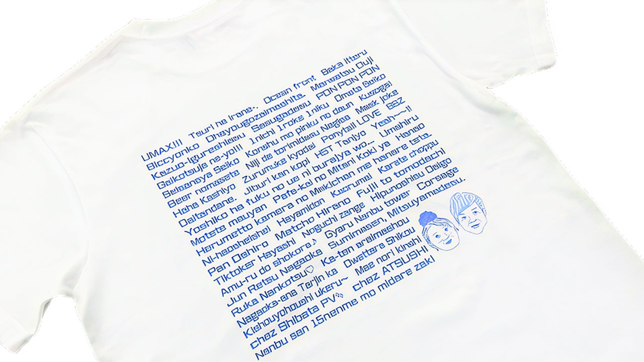 バックプリントには、友近と共に番組MCを務める東 貴博のおなじみのワード「東MAX!!!」から派生した言葉「うMAX!!!」など、放送中に出演者たちが語った名言が並びます。そのなかには「南部タワー」「流石です!」「大胆だね」といった“迷言(⁉)”も隠されています。