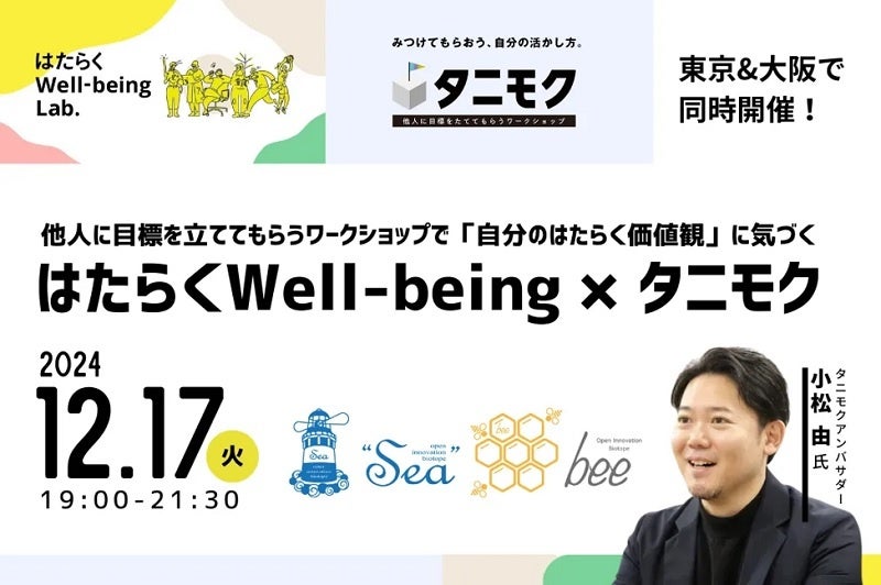 今回はその一環として株式会社オカムラと共同で、他人に目標をたててもらうという、従来とは異なる新しい目標設定手法として注目を集める「タニモク」と協業し、参加者に自身の“はたらくWell-being”について、参加者同士で学び、より深く考えてもらうことを目的としたワークショップ「はたらくWell-being×タニモク」を開催することとしました。本イベントは、さまざまな文脈で集まる人たちが共創を起こし、これからの「はたらく」の潮流をつくる場である「Open Innovation Biotope “Sea”」(東京都)と、自然にリラックスしながら新たなおもしろい発見が生まれる場を目指して共創活動を展開する「Open Innovation Biotope “bee”」(大阪府)をオンラインでつなぎ、2拠点で同時に開催します。