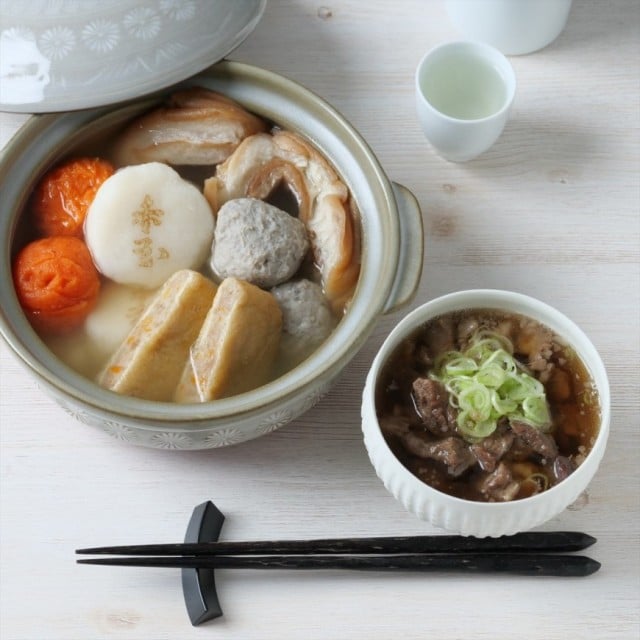 のどぐろから丁寧に取っただしを使用し、島根の県魚である飛魚を使用したあご野焼、のどぐろを使用した天ぷら、ふわふわ食感のとうふ団子が入った「島根のおでん」です。宍道湖産大和しじみが入った「しじみのおでん」との詰め合わせです。