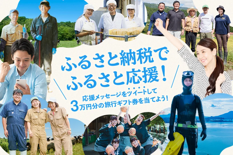 ◆ キャンペーン名: 「 #ふるさと納税で応援 」ツイートで自治体応援!10名様に3万円の旅行ギフト券が当たるキャンペーン