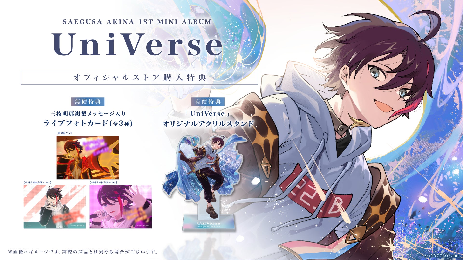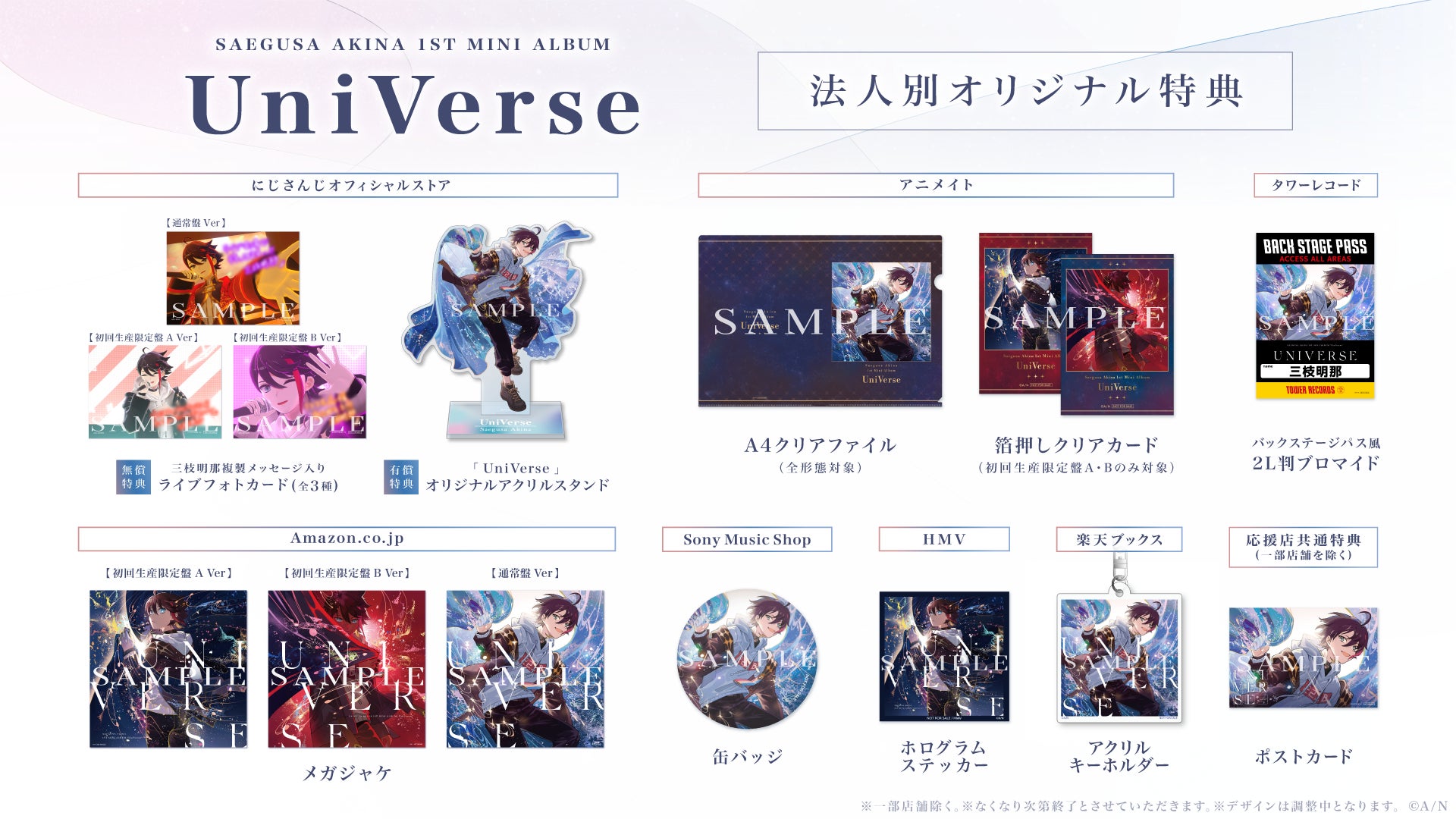 3形態共通特典として、1st Mini Album「UniVerse」に、『Saegusa Akina 1st Solo LIVE "Unity"』のチケット先行抽選シリアルコードを封入!