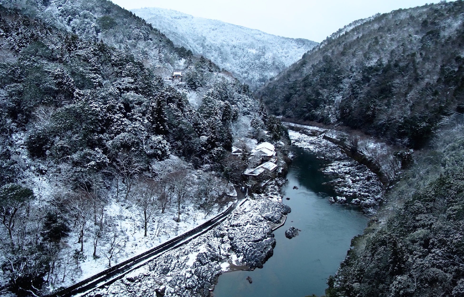 星のや京都が位置する奥嵐山は、平安貴族が四季の渓谷の風景を愛でながら過ごした風光明媚な場所です。冬には水墨画のような風景かつ凛とした空気に包まれます。川のせせらぎや動物の鳴き声、鳥が水面を羽ばたく音など、自然の音が響き渡る静寂の空間です。喧騒から離れた環境で、平安貴族も愛でた繊細な香りを楽しみ、リフレッシュしてもらいたいと考えています。