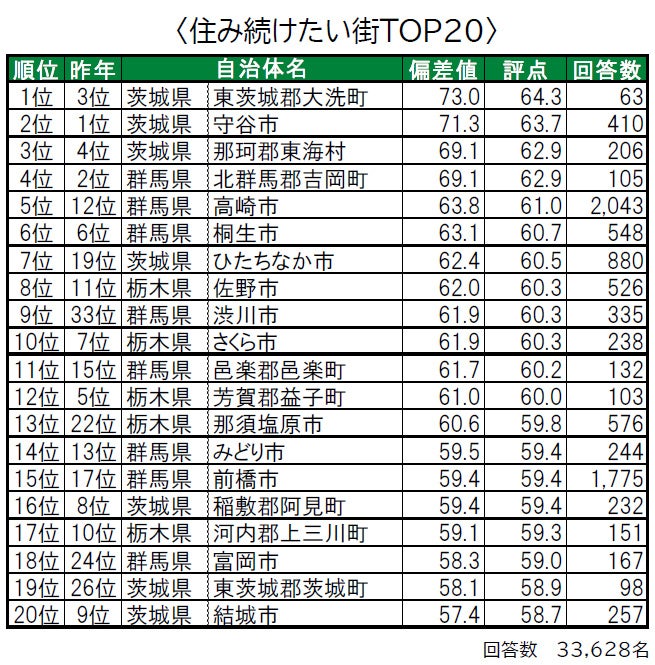 住み続けたい街のトップ3は全て茨城県で、1位東茨城郡大洗町、2位守谷市、3位那珂郡東海村。