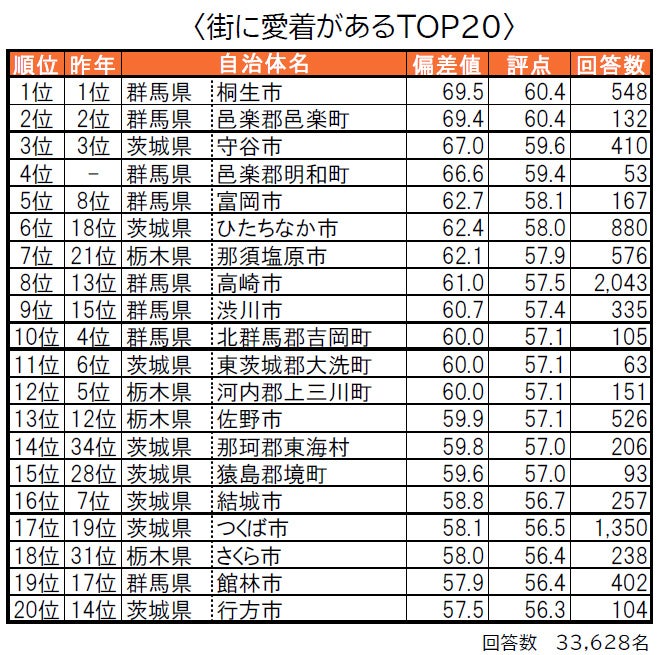 住み続けたい街/街に誇りがある/街に愛着がある<各TOP20>