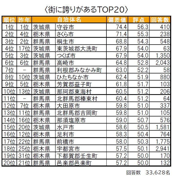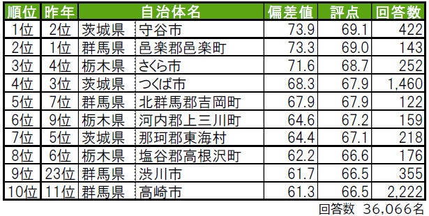 1位は茨城県守谷市で、「住みここち」「街に誇りがある」でも1位、「住み続けたい街」2位、「街に愛着がある」3位の高評価を得ています。2位は群馬県で邑楽郡邑楽町で、「街に愛着がある」でも2位です。3位は栃木県さくら市で、「街に誇りがある」で2位となっています。トップ10内では、群馬県渋川市が昨年23位から大幅に順位を上げて9位となっています。