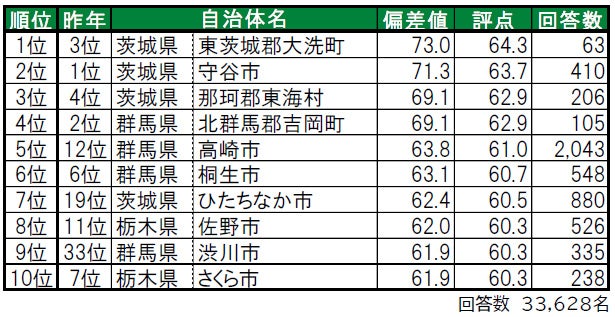 1位は茨城県東茨城郡大洗町、2位は「街の幸福度」で1位の茨城県守谷市で、いずれも偏差値70台の高い評価を得ています。3位は、茨城県那珂郡東海村です。トップ10内では、4自治体が新たにランクインしており、中でも群馬県渋川市は昨年33位から大幅に順位を上げて9位となっています。