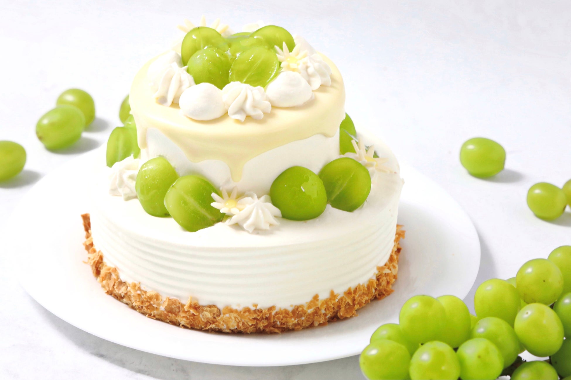 こだわり:国産のシャインマスカットを飾り付けた、季節限定の2段ケーキ。ふわふわのスポンジケー