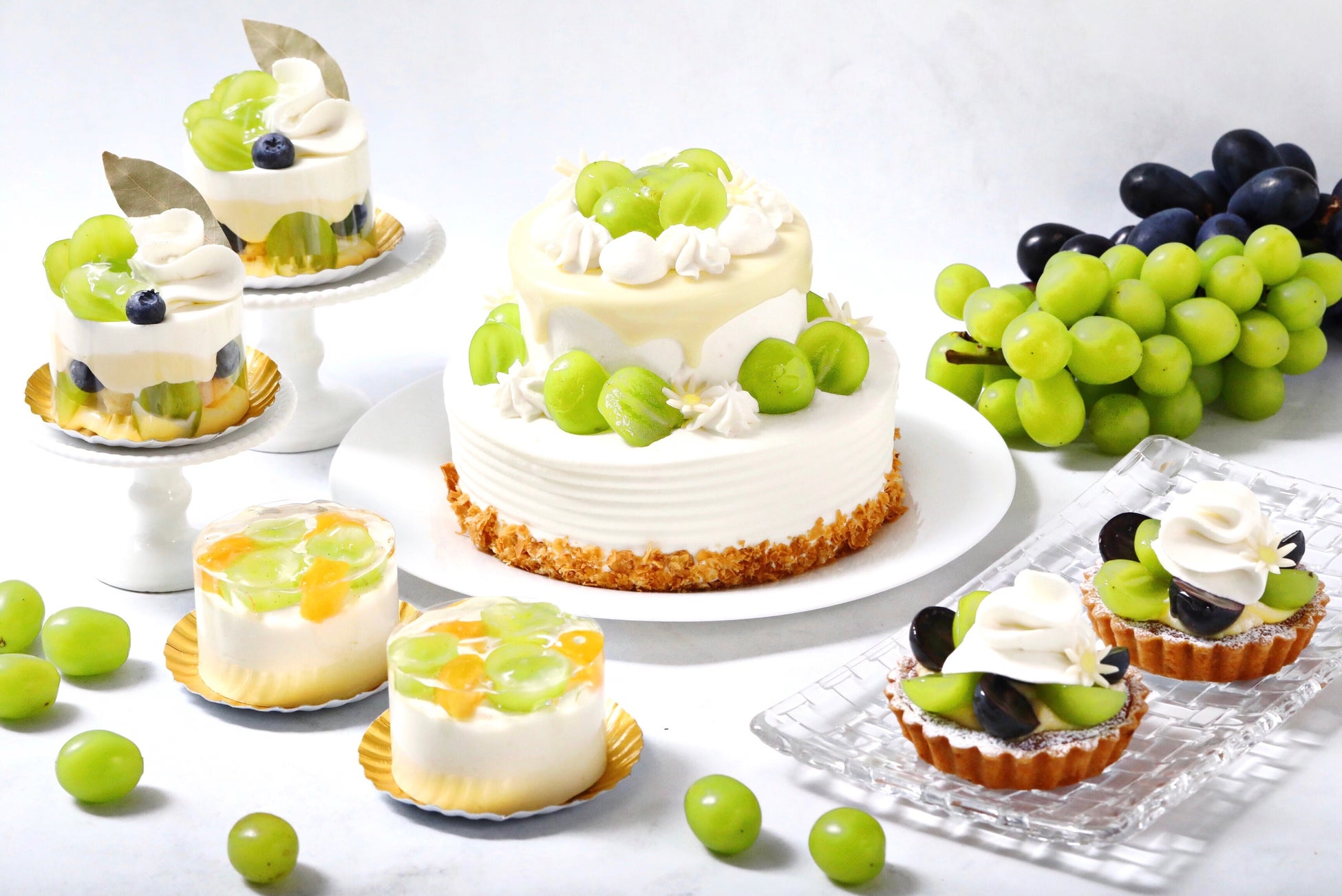 爽やかな果汁と、艶やかなグリーンの色味が目を引く国産のシャインマスカットを使用した、秋ならではのスイーツ。ピネードが提供するシャインマスカットスイーツの中でも注目なのは、国産のシャインマスカットと長野県産のぶどう「ナガノパープル」を使用した、ツートンカラーが華やかな『シャインマスカットとナガノパープルのタルト』。また、ホワイトチョコのグラサージュが美しい2段ケーキ『夢の2段ケーキ シャインマスカット』や、まるでプリンセスのようなビジュアルの『シャインマスカットのショートケーキ プリンセス』、ふんわり軽い食感のレアチーズムースで仕上げた『シャインマスカットのレアチーズ』など、シャインマスカットの新商品が多数登場。