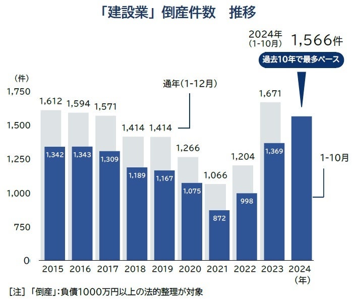 中小建設業の苦境が続いている。2024年に発生した「建設業」の倒産(負債1000万円以上、法的整理)は、10月までに1566件となった。8年ぶりの高水準を記録した前年をさらに上回る急増ペースで推移し、通年では過去10年で最多を更新する見込みとなっている。