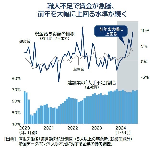 木材をはじめとした建築資材価格の高止まりに加え、建設現場での「職人不足」と求人難に伴う人件費の高騰が、中小建設業者の経営を圧迫している。帝国データバンクの調査では、人手不足感を抱える建設業の割合は2024年9月時点で69.8%に上り、高水準での推移が続いている。