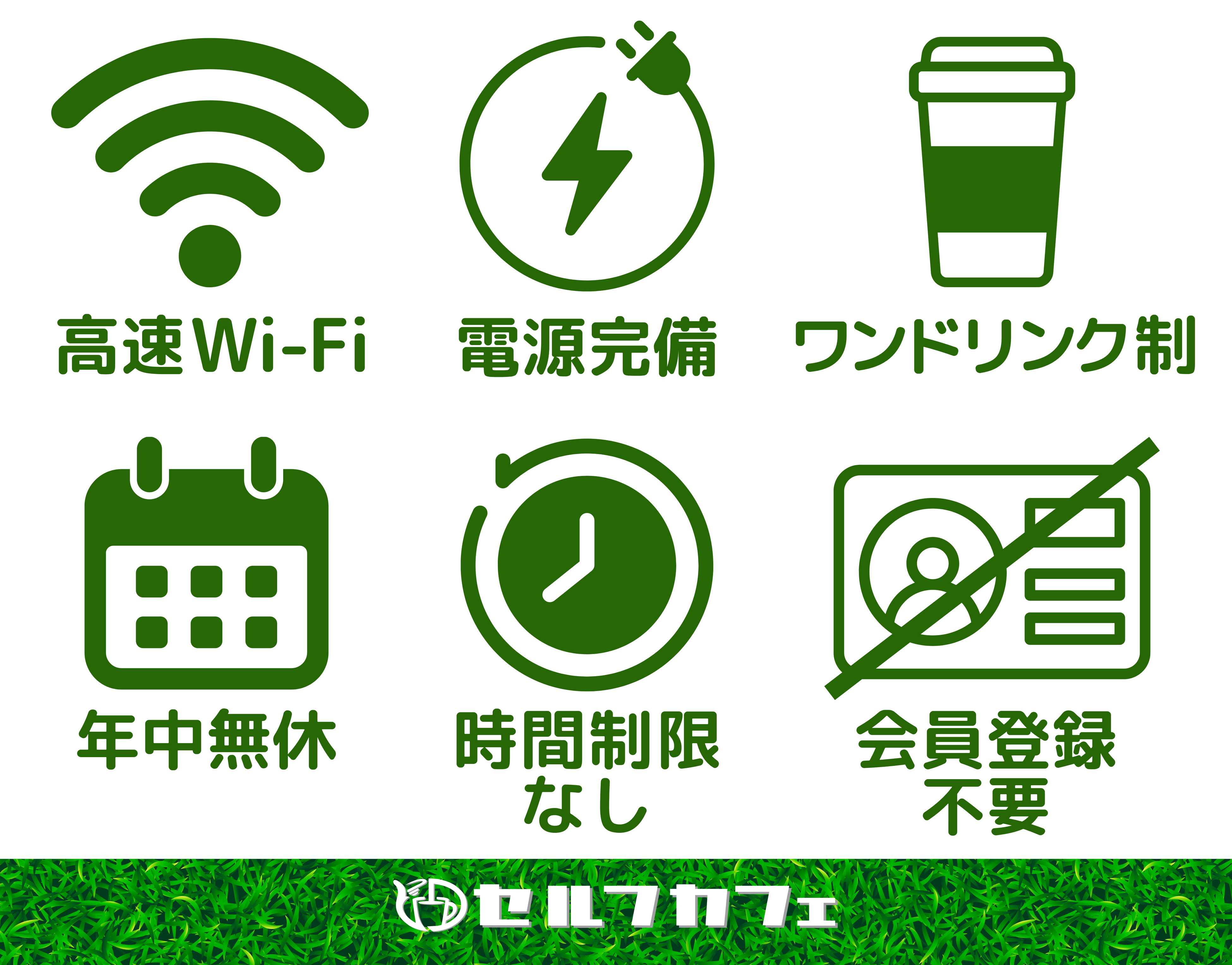 利用方法:ドリンク購入後、時間制限なくご利用可能。会員登録・アプリ不要