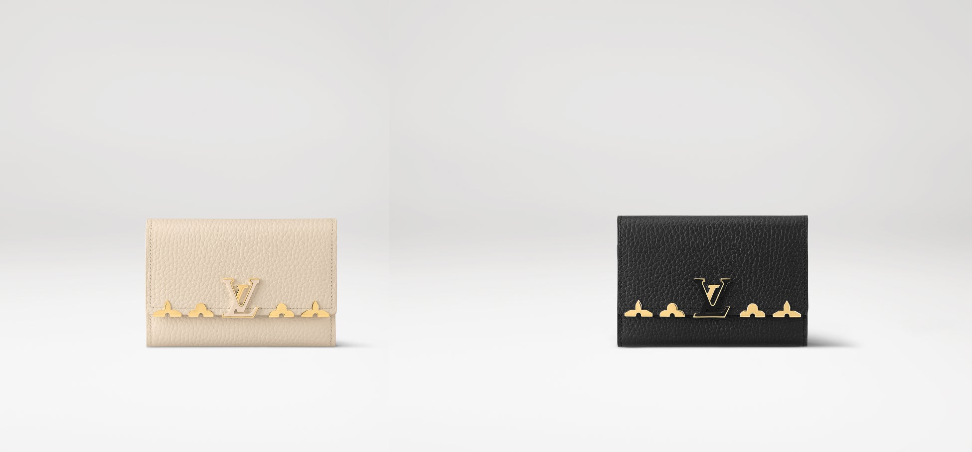 スタイルと実用性を併せ持つ「ポルトフォイユ・カプシーヌ コンパクト」。フルグレインのしなやかなトリヨンレザーで仕立てた小ぶりの財布は、8つのカードスロット、ファスナー付きコインケース、紙幣のためのポケット、2つのフラットポケットを備えています。中の物を安全に守るLV イニシャルのスナップボタンタイプの留め具も魅力です。