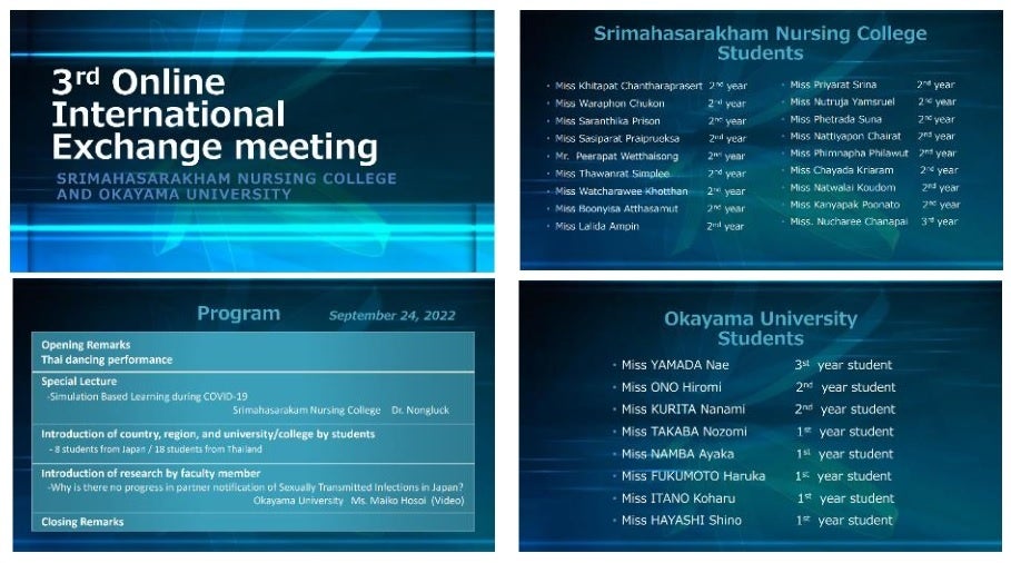 国立大学法人岡山大学(本部:岡山市北区、学長:槇野博史)の医学部保健学科・大学院保健学研究科は、2022年9月24日(土)、部局間協定を結んでいるタイのシーマハサラカム看護大学と 2020年、2021年に続き、本年度も Zoomによるオンライン交流会を開催しました。