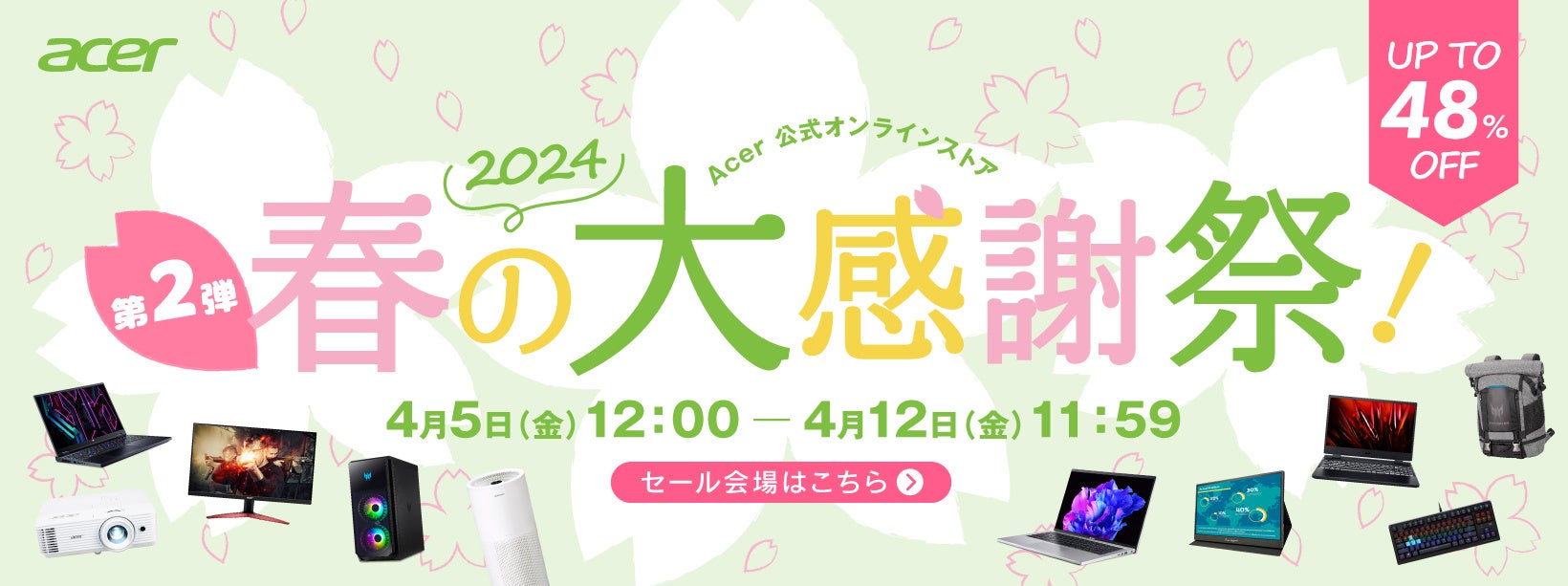 日本エイサー株式会社(本社:東京都新宿区、代表取締役社長:ボブ・セン)は、同社のパソコン、モニター、プロジェクター、ゲーミングマウスやキーボードなどのガジェット、空気清浄機などの各種製品を取り扱うAcer 公式オンラインストアで最大48%OFF「春の大感謝祭 第二弾」を、本日2024年4月5日(金)午後12:00から4月12日(金)午前11:59までの期間限定で開催します。