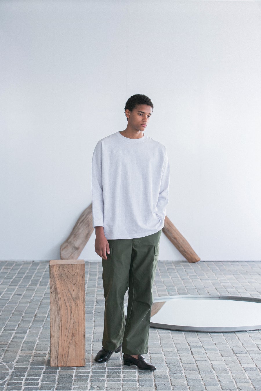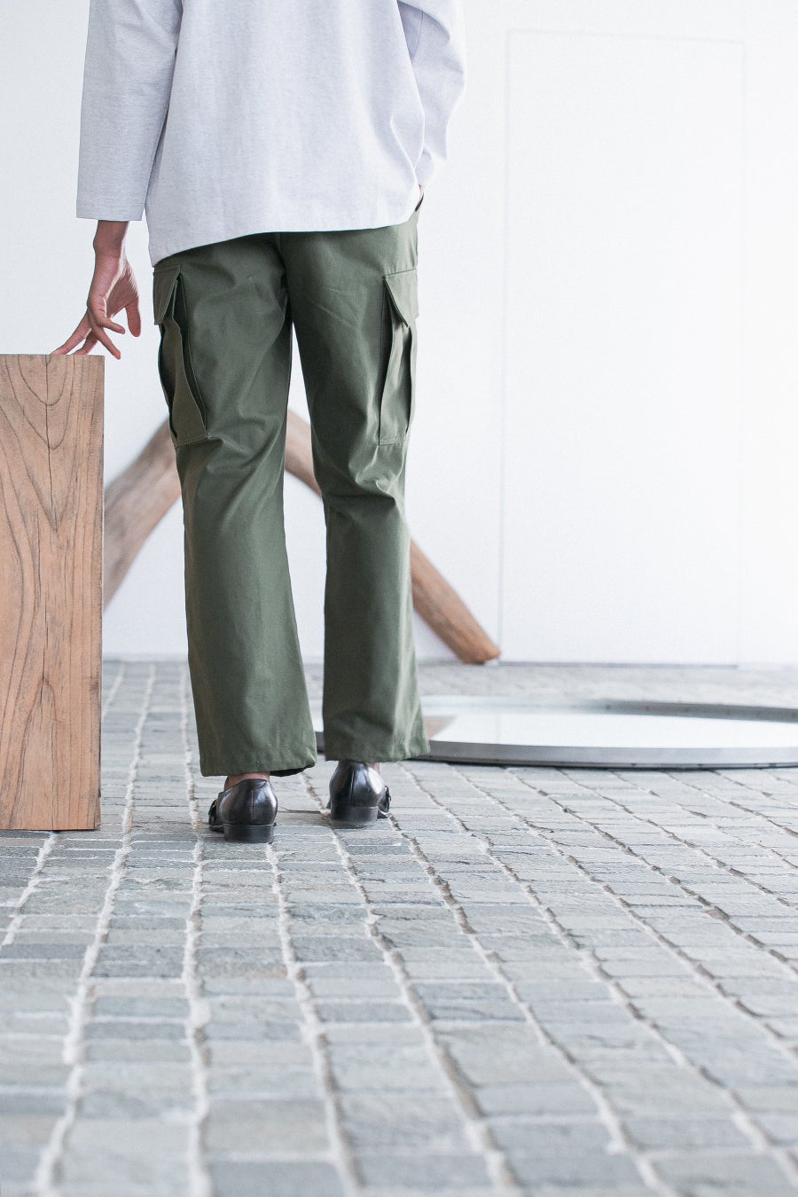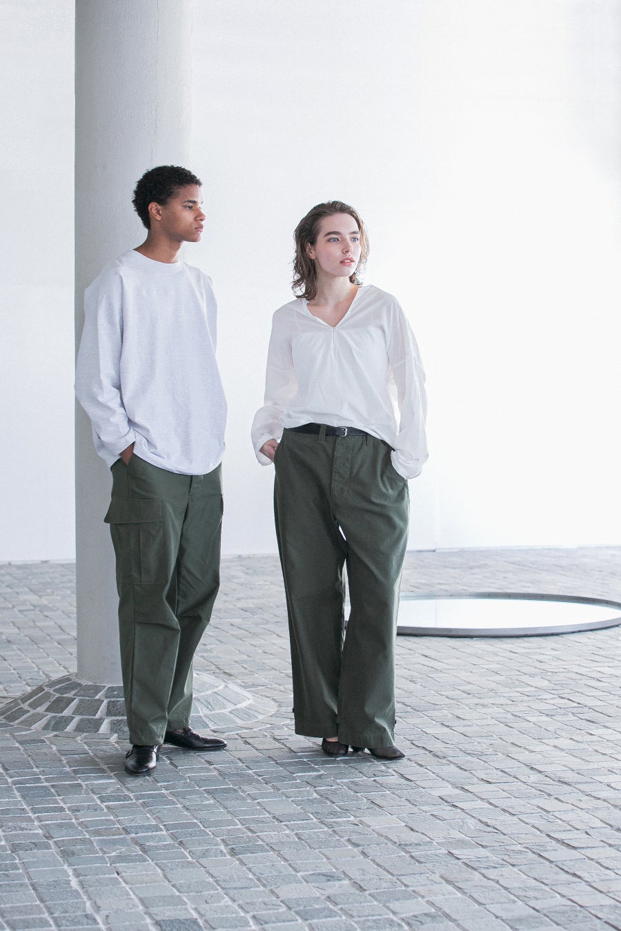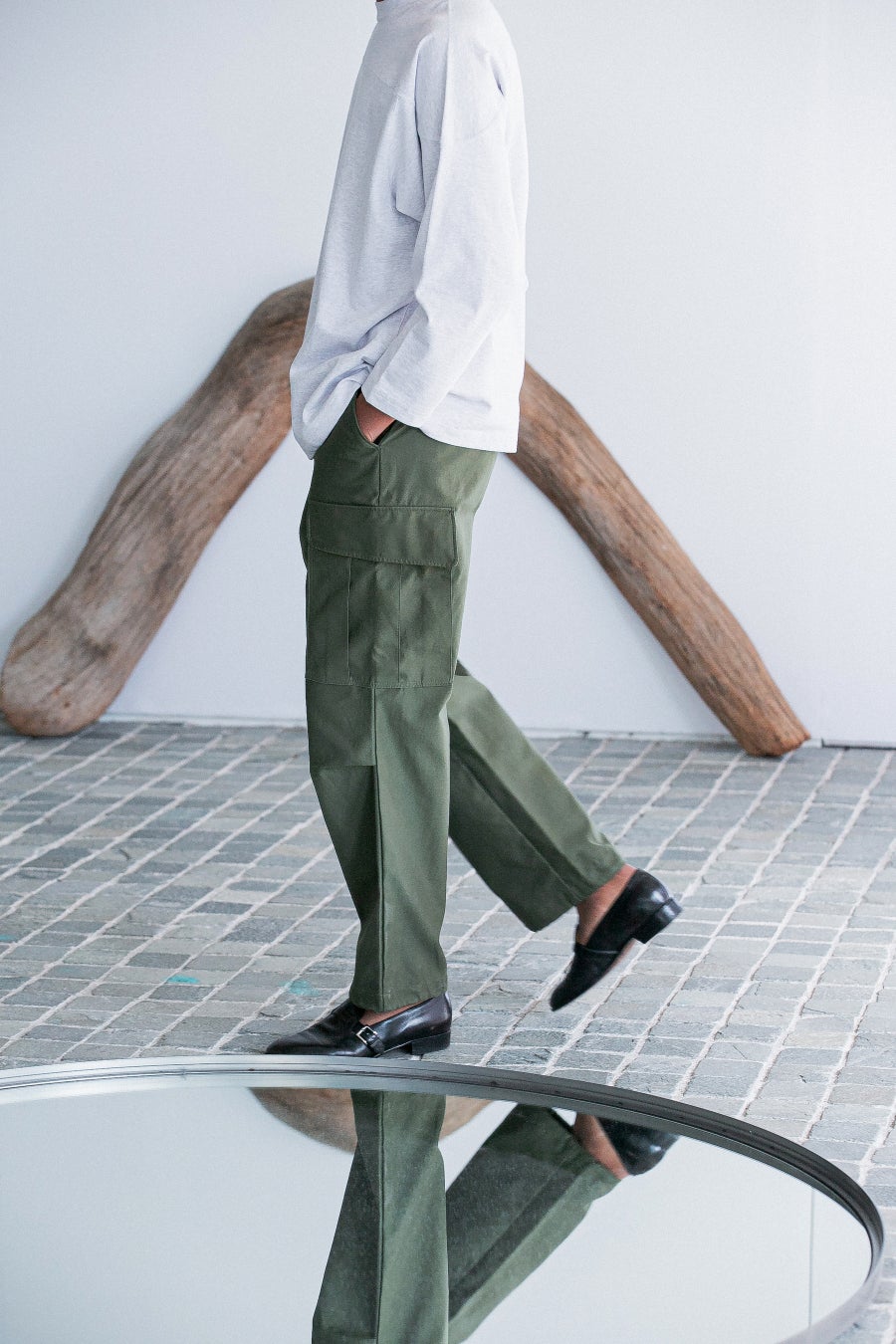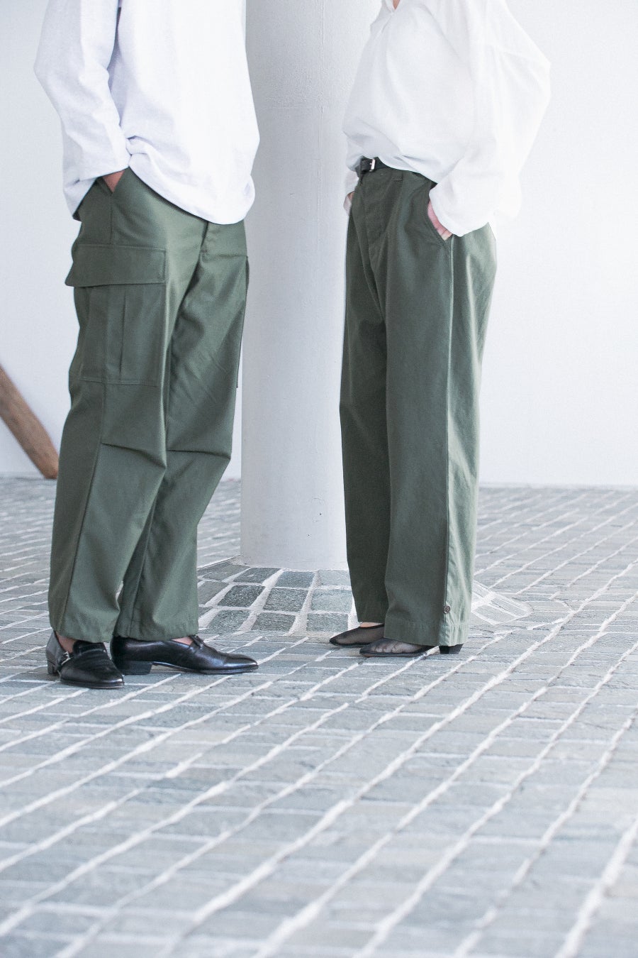 インラインでも展開のあるUS 3rdタイプのジャングルファティーグパンツを、スビンコットンのウエポン素材を特別に使用し作成。インラインのノンリップ生地を使用したシャカシャカした生地感に対して、今回の別注では上述の生地を使用しているため上品な佇まいとなっており、きれいめなスタイルにも合わせやすく経年変化も楽しめるアイテムに仕上がっています。