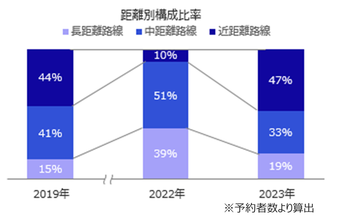 距離別で比較すると、前年は唯一ツアーを再開していたハワイが首位で、ハワイを含めた中距離路線が半数を占めておりましたが、今年は大幅に近距離路線の需要が増加しており、コロナ前と同等レベルの比率になっております。前年より20ポイント落ちたものの長距離路線も2割弱を占めており、ヨーロッパ方面が復調しております。中でもパリの人気が高く、2019年比でみても57.5%と他方面と比較して回復が早いのが特徴です。