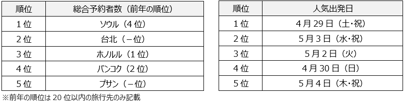 上位には近距離の3都市がランクインしました。年末から続くソウル人気に続き、前年はランク外だった台北が急上昇しております。長らく続いていた台湾到着後の自己健康管理、空港到着後の検査は不要となり、軽症者の隔離措置も解除されるなど、水際対策を大幅に緩和したことにより、旅行先として再び人気が高まっております。また、再開したクルーズ旅行の需要も高く、外国客船の寄港地となる台北、プサンを押し上げる要因にもなっております。