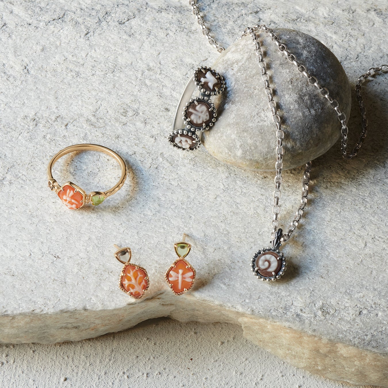 繊細で優美な装飾。温かみのある質感。人は紀元前の昔からカメオに美を見出し、さまざまな想いをかたちにしてきました。脈々と受け継がれてきた緻密なテクニックでアガットが表現したのは、今にも動き出しそうな古代の生きものたち。かつての地球とつながるようなユニークなジュエリーです。