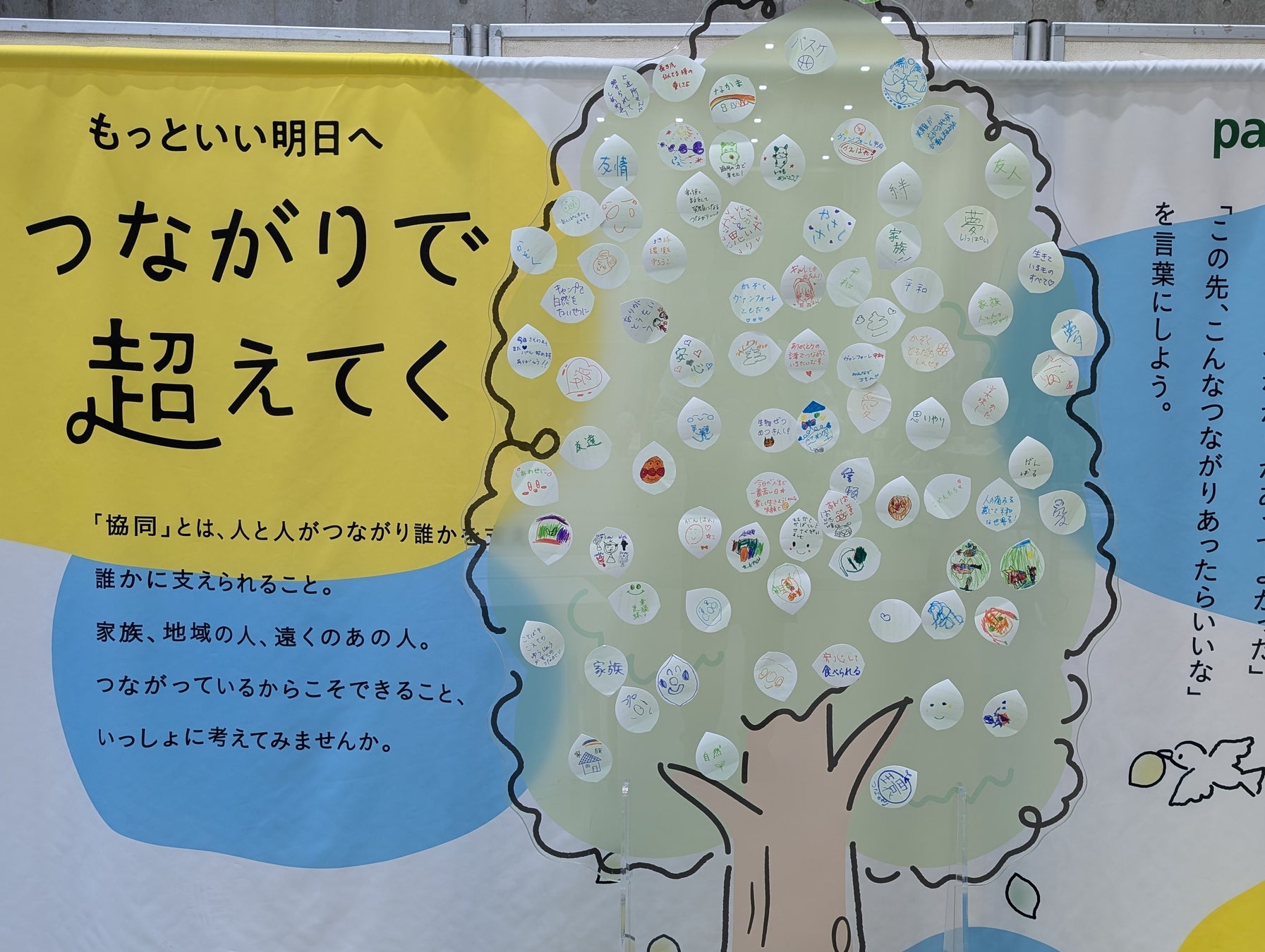 会場内では、2025年が国連の定める「国際協同組合年」であることから、特設ブース「つながりで超えてく」を設け「つながり」にまつわるメッセージを募集しました。ブース中央に設置された「メッセージツリー」には「平和」「愛」思いの詰まった言葉のほか、子どもからのイラストも多く寄せられ、およそ100枚の葉がツリーを彩りました。