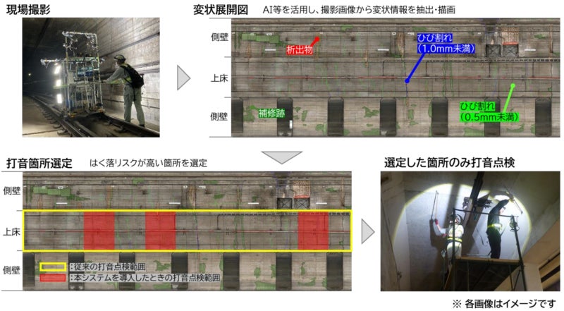 東京地下鉄株式会社(本社:東京都台東区、代表取締役社長:山村 明義、以下「東京メトロ」)では、トンネルの点検業務の効率化を目指し、今年度から、トンネル表面の画像を基にした「打音点検箇所抽出システム(以下「本システム」)」を打音点検に導入していきます。この取り組みは東京メトロのCBM※技術開発の一環として位置付け取り組んでまいりました。