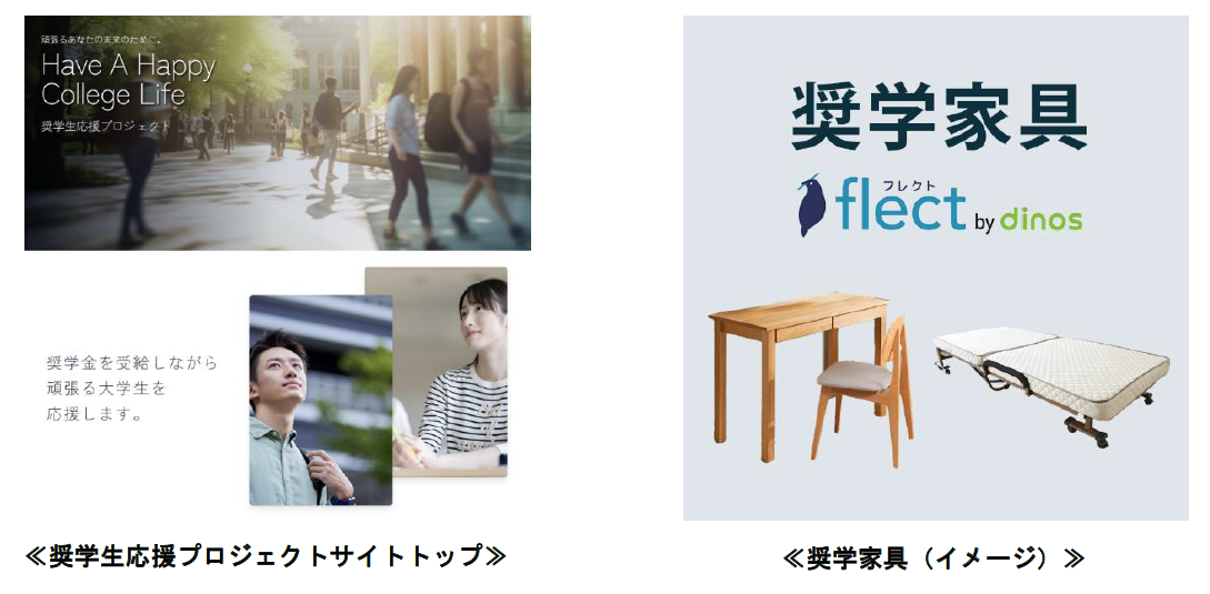 プロジェクト開始となる今年度は、中央大学、明治大学に通う公的奨学金を受給する学生を対象に、DINOS CORPORATIONで展開する新品家具レンタルサービス「flect」で返却された家具を『奨学家具』として無償提供を行うほか、京王不動産では、自社貸主物件または管理物件の賃貸住宅契約時においてフリーレント1か月または仲介手数料を無料とする取組みを実施します。また、京王電鉄では、本プロジェクトの円滑な推進のため、賛同いただける大学との連携、自社広報媒体等を用いた認知度向上に取り組みます。
