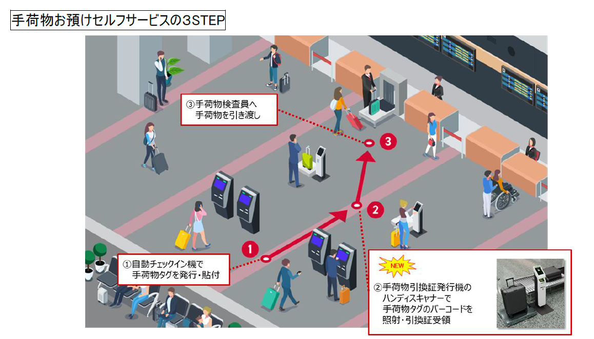 お客さまがKIOSK端末で発行した手荷物タグにバーコードリーダーを照射することで手荷物引換証を発行し、簡単に手荷物を預けることができるようになります。また自動チェックイン機(図①)と手荷物引換証発行機(②)をお客さまが搭乗手続きしやすい導線を考慮した位置に配置することで、お客さまのチェックインおよび手荷物預けの待ち時間の大幅な短縮が可能になります。