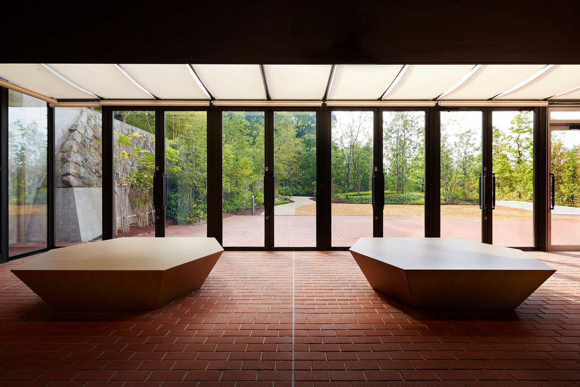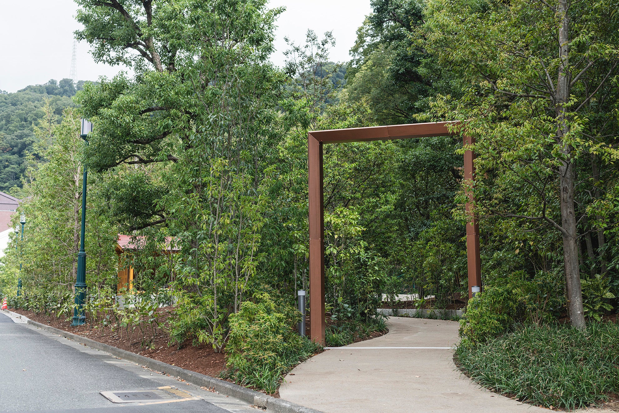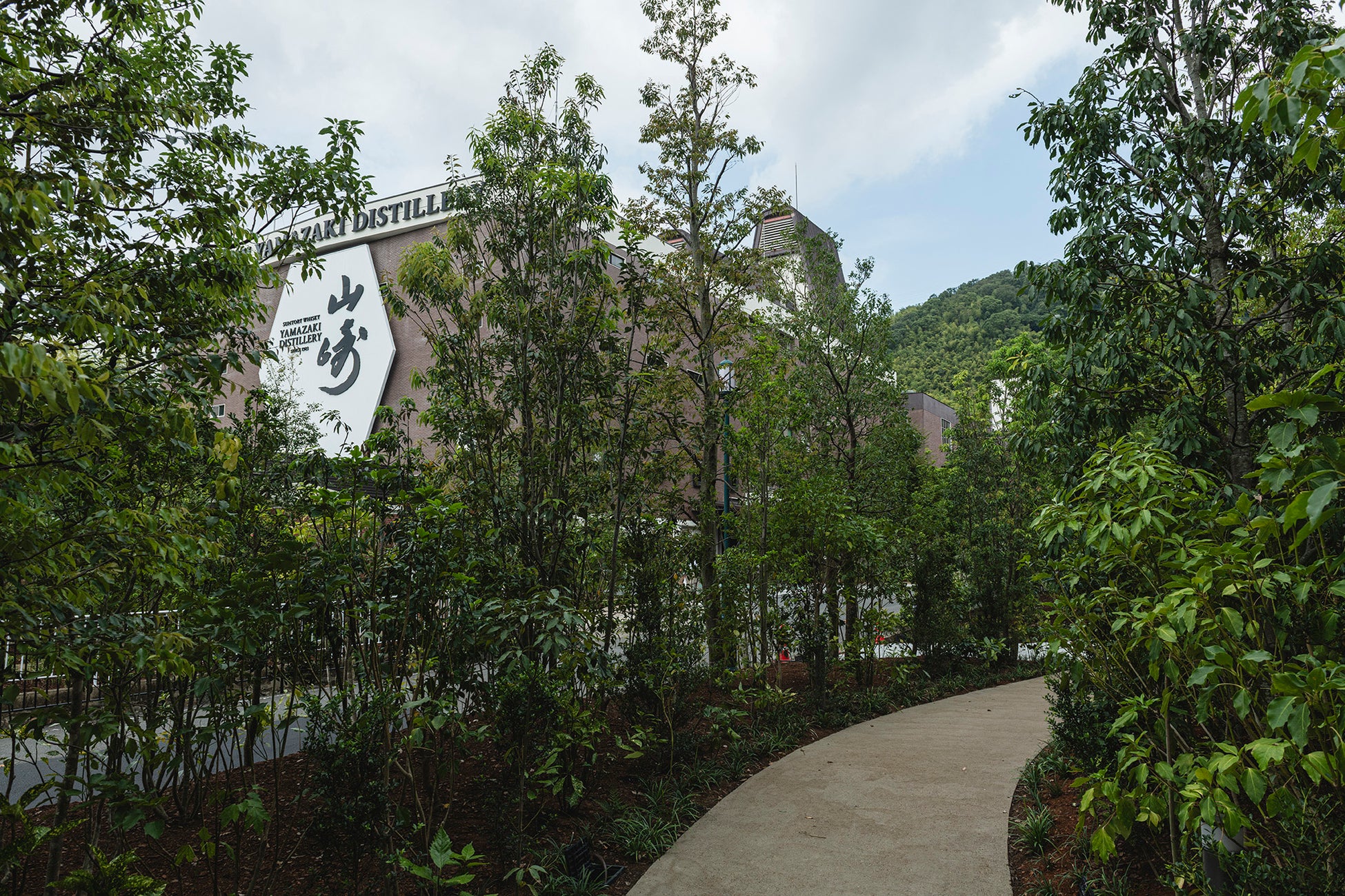 100周年を迎える新たな山崎蒸溜所の装いとして、エントランス部分をはじめとした敷地内に自然との調和を表現した“杜”を形成するため、周辺エリアの島本町や大山崎町の山林地に生育する草木などを植栽し緑地化しました。蒸溜釜の銅素材を再利用した門をくぐり抜け、山崎の“杜”ならではのどこか神秘性も感じられる空気感を味わいながら、見学ツアーや場内見学の新たな受付となる山崎ウイスキー館へのアプローチをお楽しみいただけます。