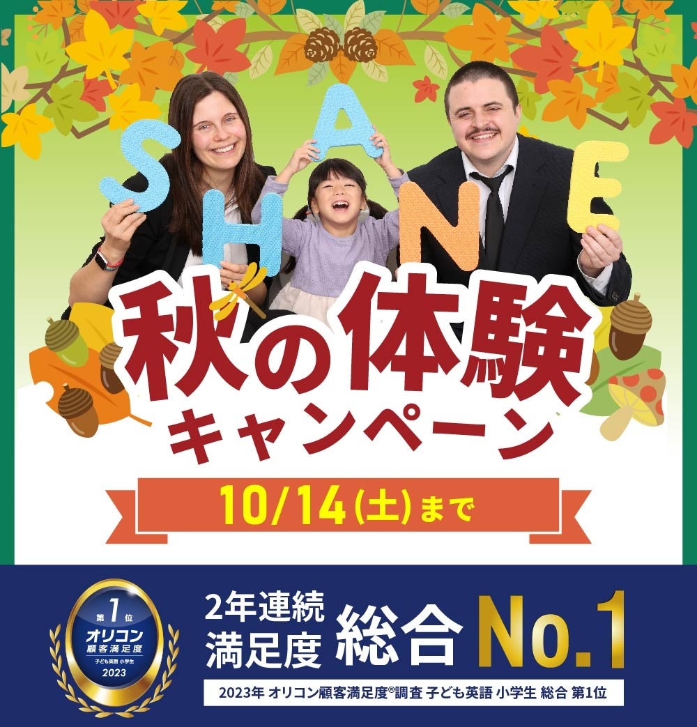 株式会社増進会ホールディングス(Z会グループ)のグループ会社、株式会社シェーンコーポレーション(本社:東京都千代田区 代表取締役社長:石谷雄也)が運営する英会話スクール「シェーン英会話」は、秋の体験キャンペーン第2弾を2023年9月20日(水)~10月14日(土)に開催します。