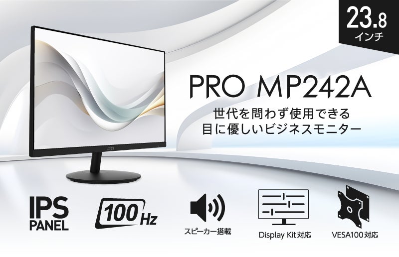 「PRO MP242P」は手頃なサイズ感でデスクにも設置しやすい23.8インチ、高画質なIPSパネル、フルHD(1,920 × 1,080)解像度でビジネスやテレワークなどにお勧めなモデルです。MSIが提唱する世代を問わずに安心して使用できる「EyesErgoモニター」として、「ゲーミングモニター並みのリフレッシュレート100Hzでページのスクロール時にも滑らかな表示」「映り込みや反射を抑えるノングレアパネル」「チラつきを抑制するアンチフリッカー」「ブルーライトカット」の4つの目の疲労を軽減する機能を搭載しています。また、内蔵スピーカー(2W + 2W)やキーボード・マウスからモニターの設定を行うことができる「Display Kit」対応に加え、マルチモニター環境を構築しやすい3辺フレームレスデザインとVESA規格のモニターアーム、対応したミニPCの取り付けも可能です。