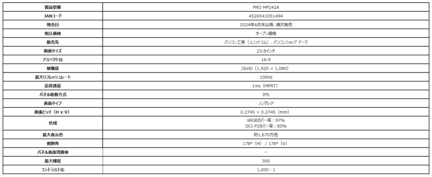 世代を問わずに使用できる目に優しい「EyesErgoモニター」23.8インチ・フルHD・スクロール時も見やすいリフレッシュレート100Hzユニットコム専売モデル「PRO MP242A」発売