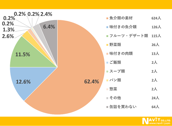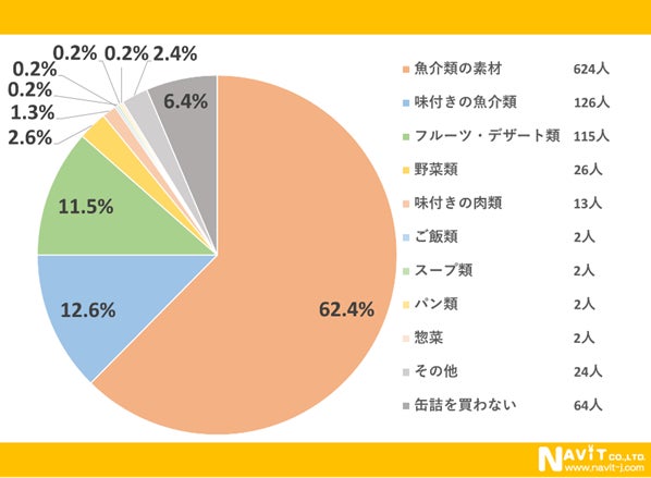 缶詰の種類で一番多く購入されているのは「魚介類の素材」が62.4%と一番多く、次が「味付きの魚介類」で12.6%となっています。次が「フルーツ・デザート類」で11.5%と続いています。風邪を引いた時には定番の桃缶が思い出されます。