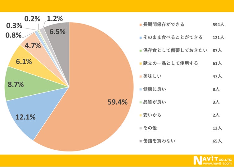 缶詰を購入する一番の動機は「長期保存ができる」で59.4%となっております。次に「そのまま食べることができる」が12.1%、「保存食として備蓄しておきたい」が8.7%と続いています。