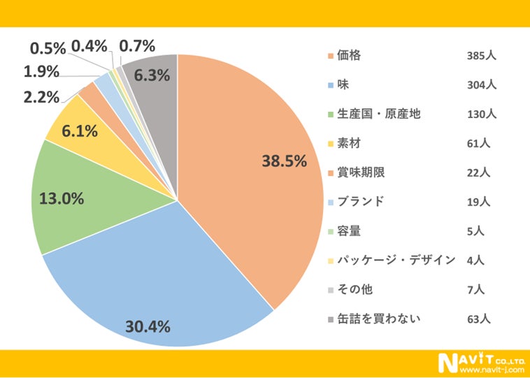 缶詰を買う際に最も重視していることは「価格」が38.5%と最も多く、続いて「味」が30.4%となっています。次に「原産国」13.0%と続いていて安全性も気になるポイントのようです。