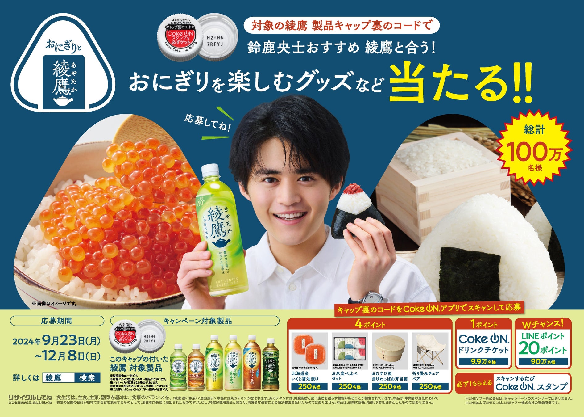2024年9月23日(月)より、対象の「綾鷹」・「綾鷹カフェ」のキャップ裏のコードをCokeONアプリでスキャンすることで、「北海道産いくら醤油漬け」、「お米食べ比べセット」、「おむすび型曲げわっぱお弁当箱」など、「綾鷹」とおにぎりを楽しむグッズなどが当たるキャンペーンを実施します。
