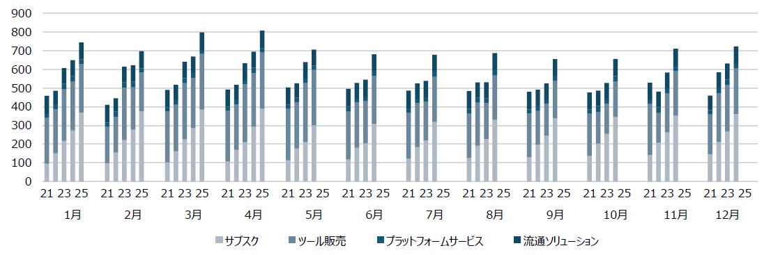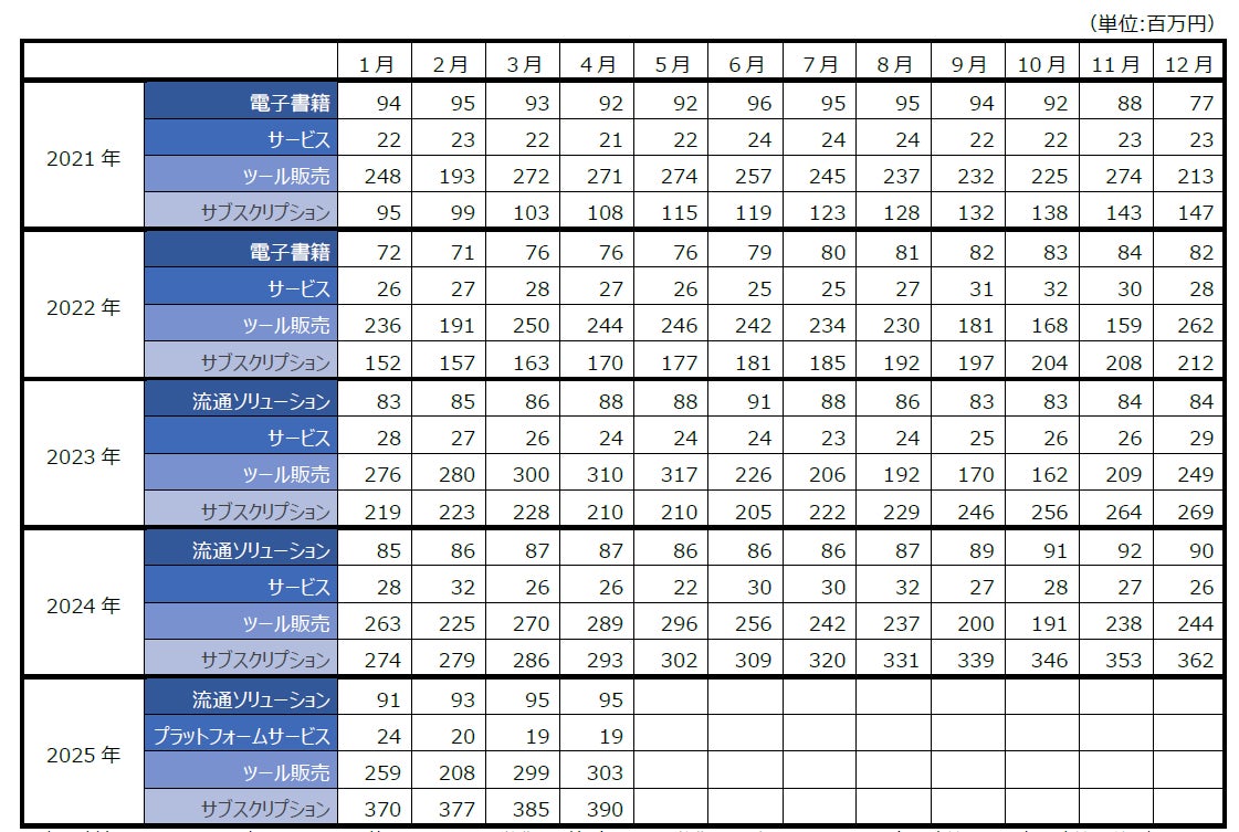 サブスクリプションは、CLIP STUDIO PAINT サブスクリプション売上です。ツール販売には、一括支払いモデルのダウンロード版や法人向けライセンスの売上などが含まれます。プラットフォームサービスには、CLIP STUDIO WEBサービスでの売上等が含まれます。流通ソリューションには、電子書籍及びDC3に関連する売上が含まれます。