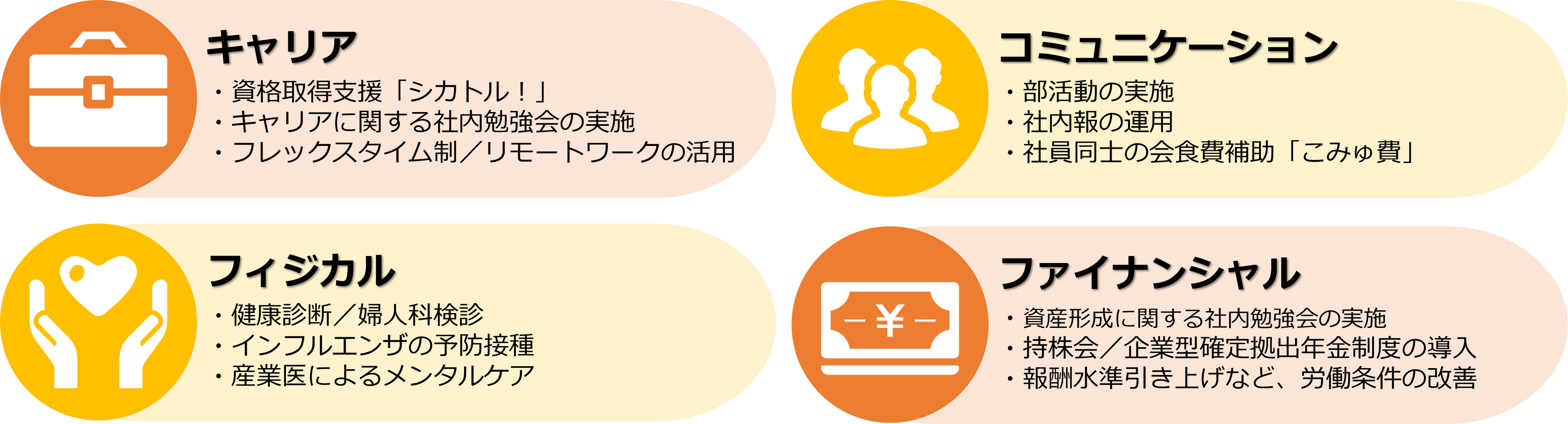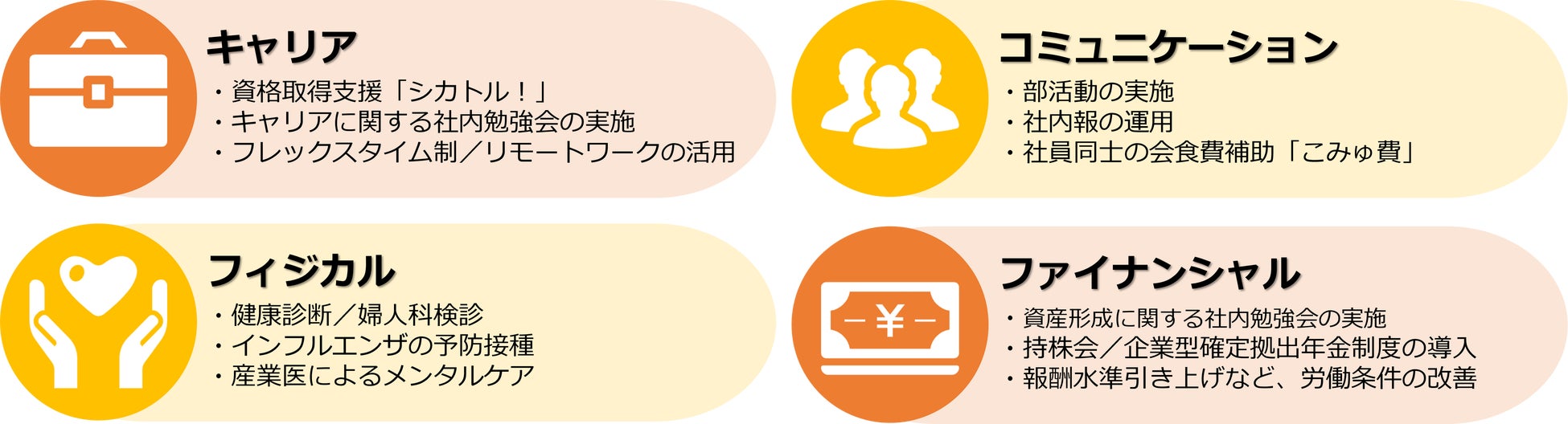ビジョンの実現に必要な人材(従業員)が、安心して働ける職場環境の整備や成長支援、従業員同士の交流の促進など、様々な視点から福利厚生及び人事制度の整備を進めております。今後も、従業員一人ひとりの背景に寄り添った、時流に即した制度の充実を図ってまいります。