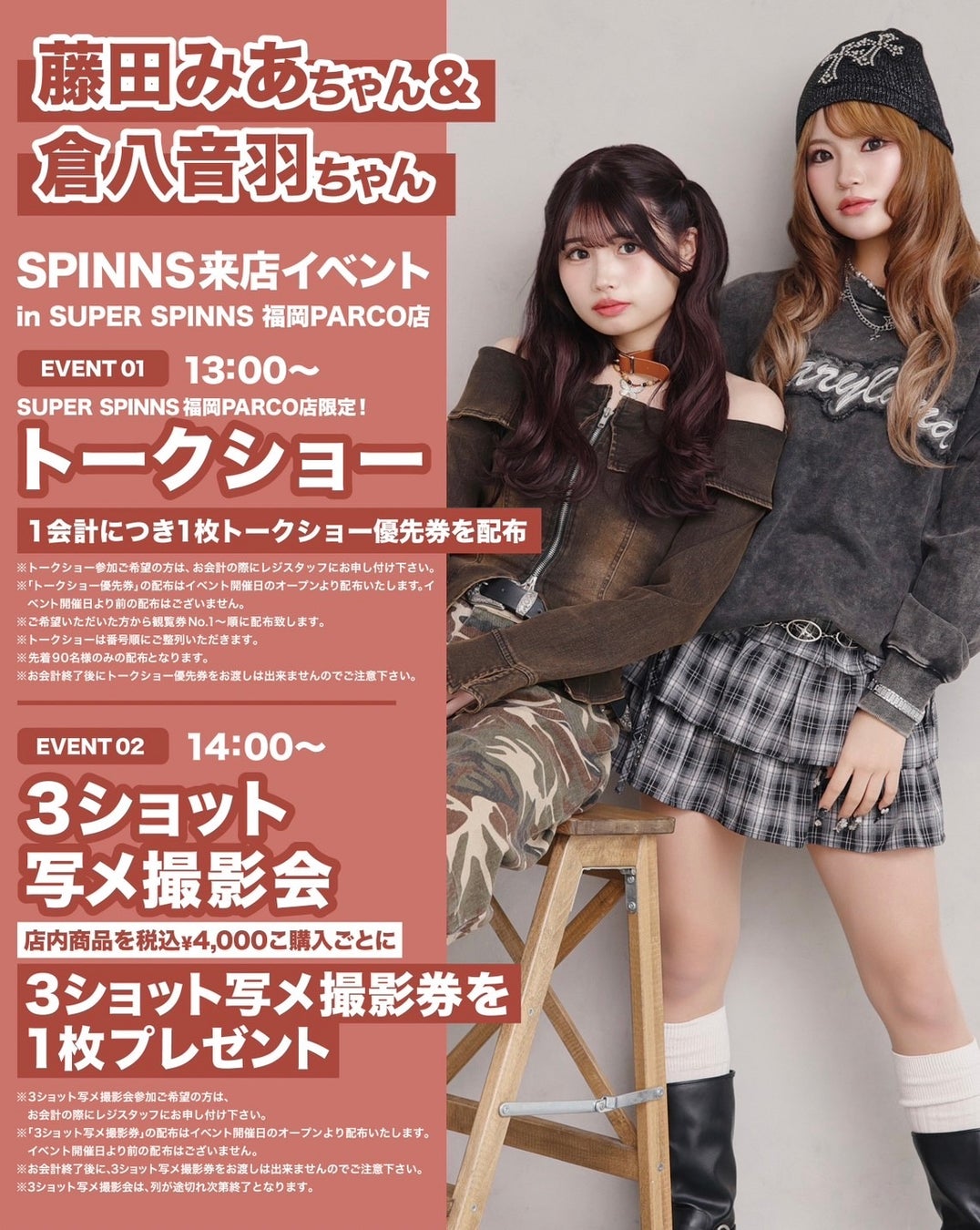 若者向けアパレル事業を中心に展開する、株式会社ヒューマンフォーラム(本社:京都市中京区 代表取締役会長:出路雅明)が運営する「SPINNS(スピンズ)」がsweet16委員会より、Z世代に大人気『藤田みあちゃん、倉八音羽ちゃん』を起用したビジュアルを展開します。さらに、イベントの開催も決定。