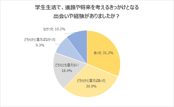 約6割が「学生生活で、将来を考えるきっかけとなる出会いや経験があった」と回答。一方、「オンライン授業が大半で、リアルな場で体験や経験の機会を得ることができなかった」の声も/2024年卒対象アンケート
